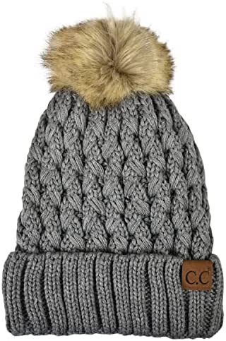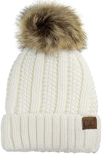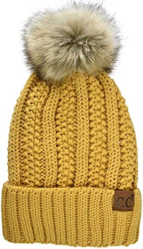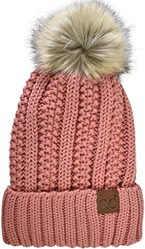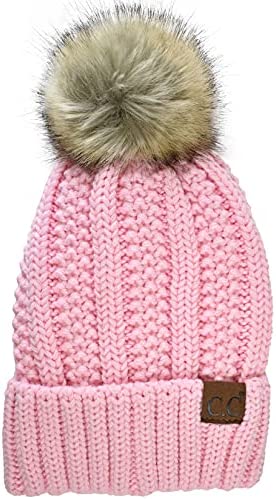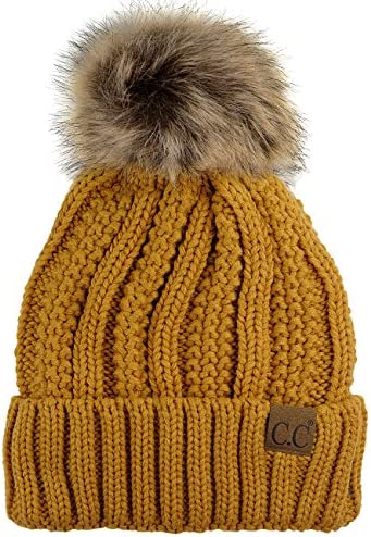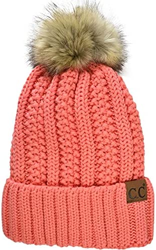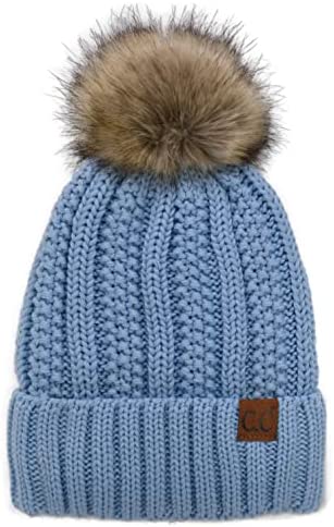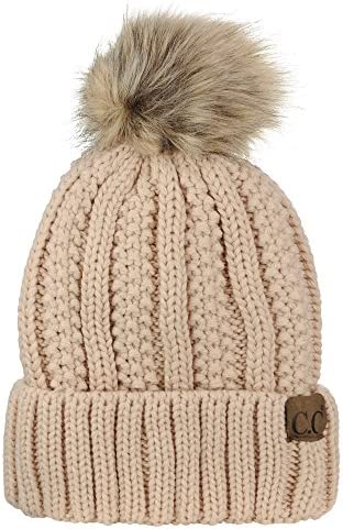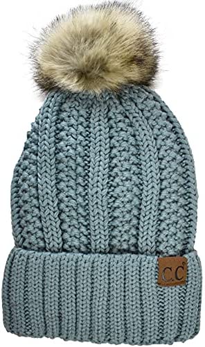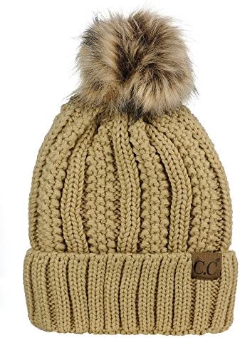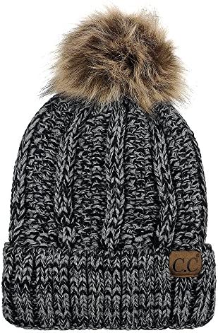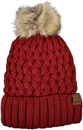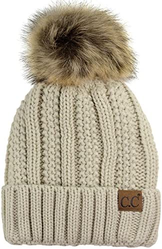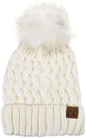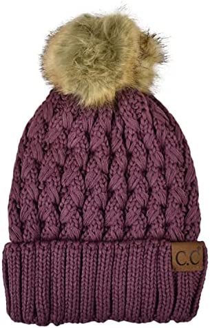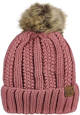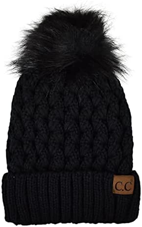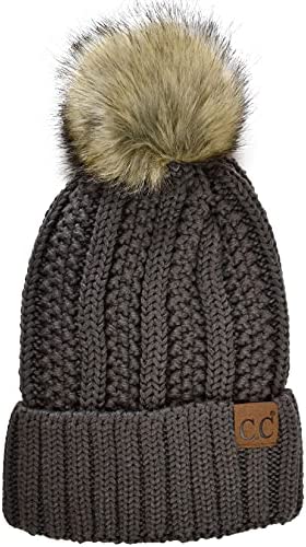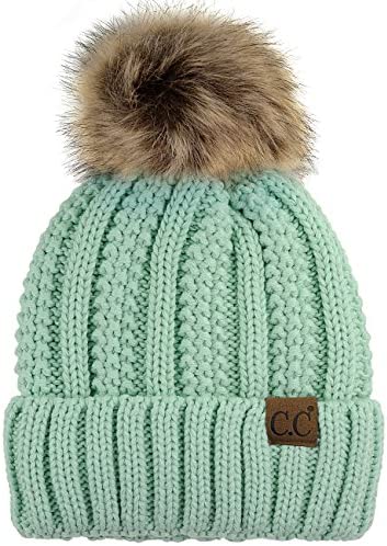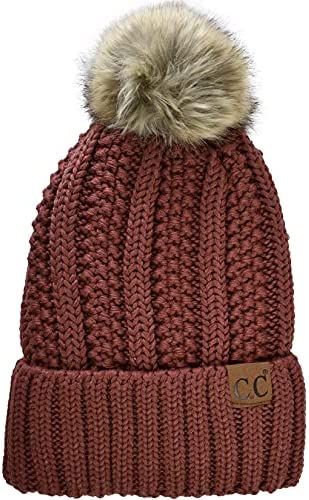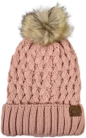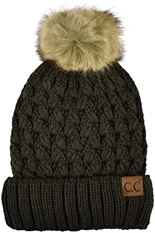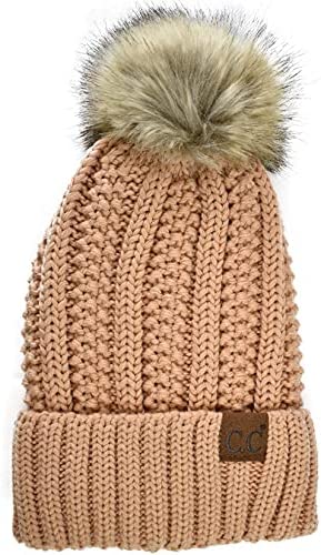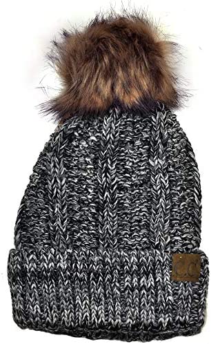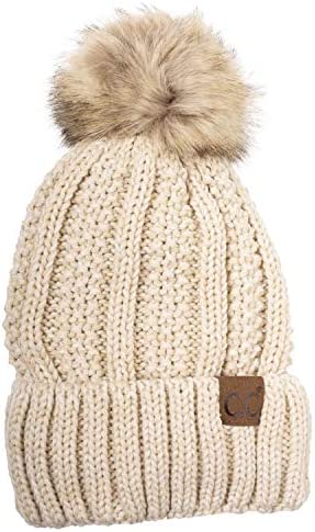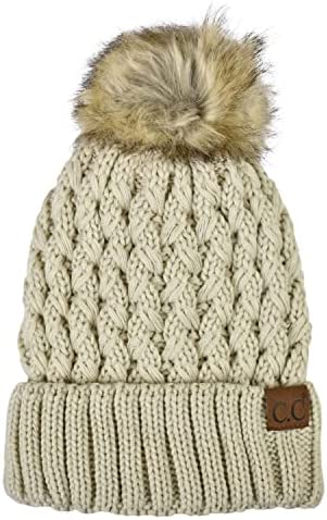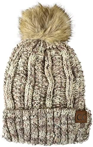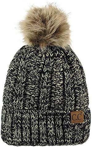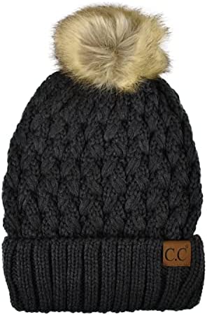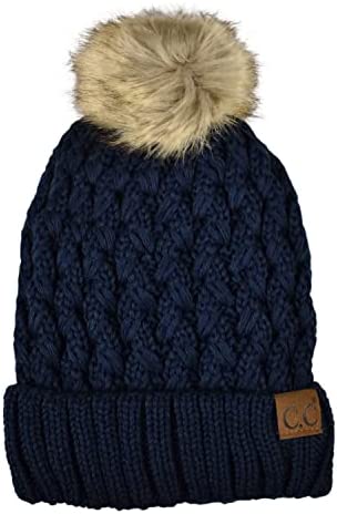 C.C Thick Cable Knit Faux Fuzzy Fur Pom Fleece Lined Skull Cap Cuff Beanie