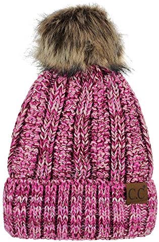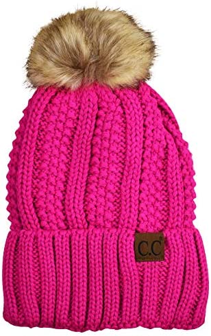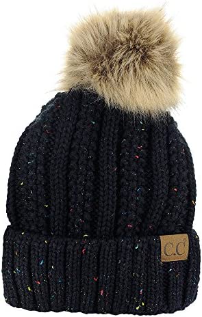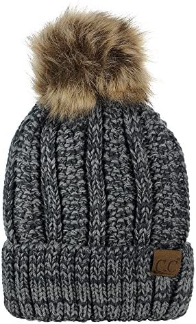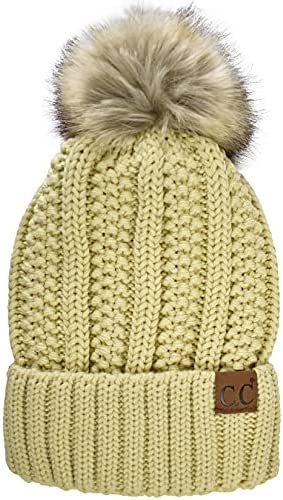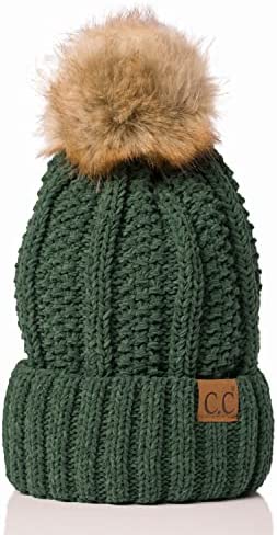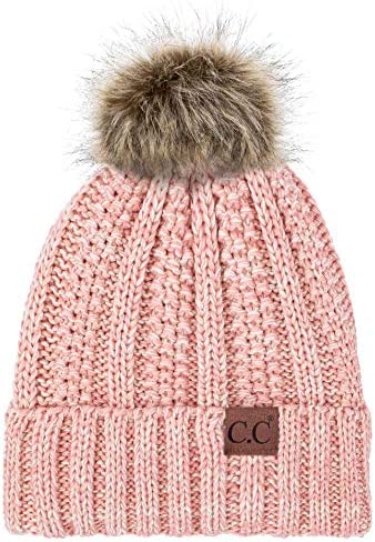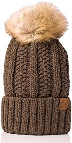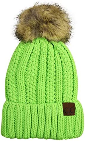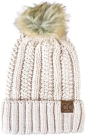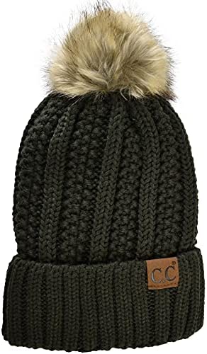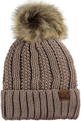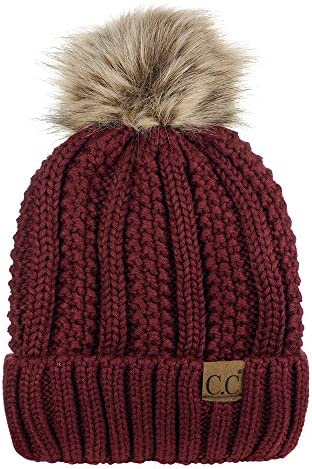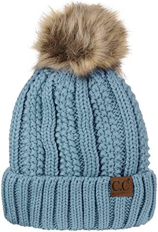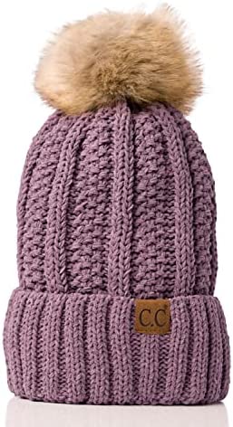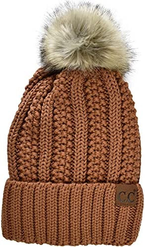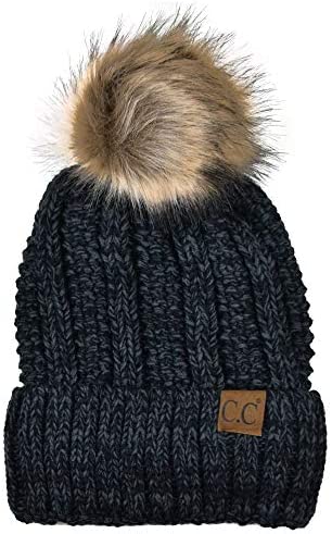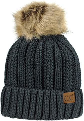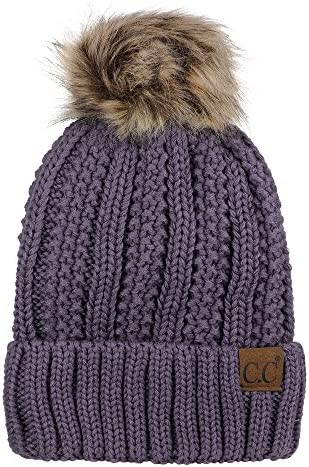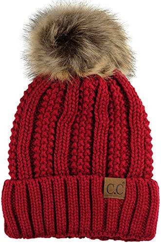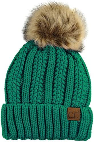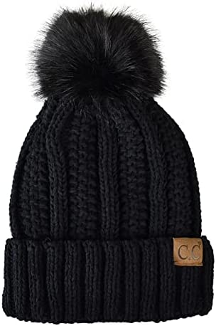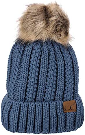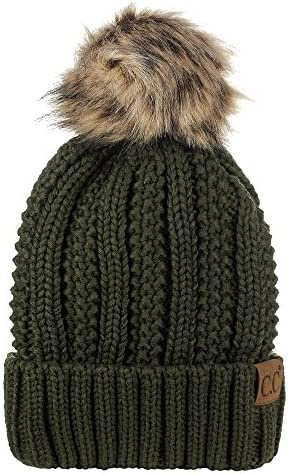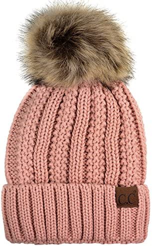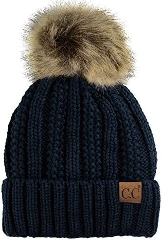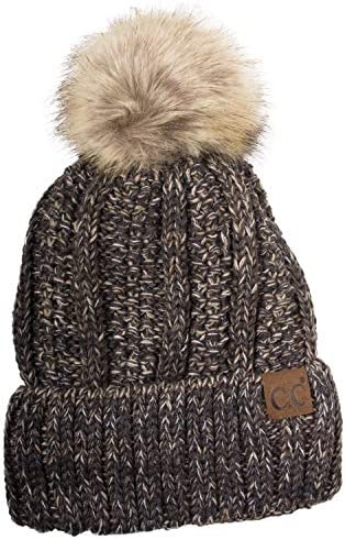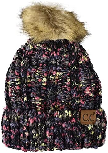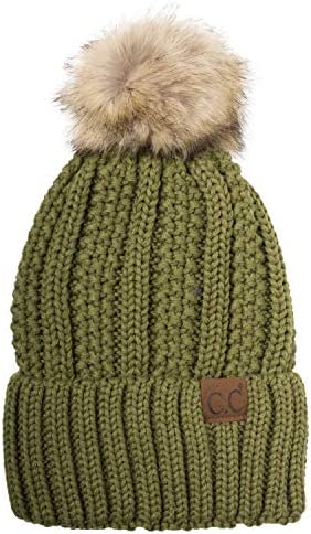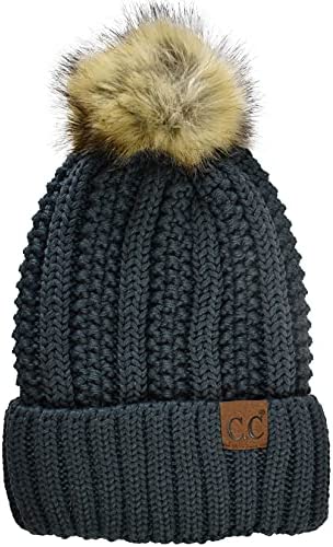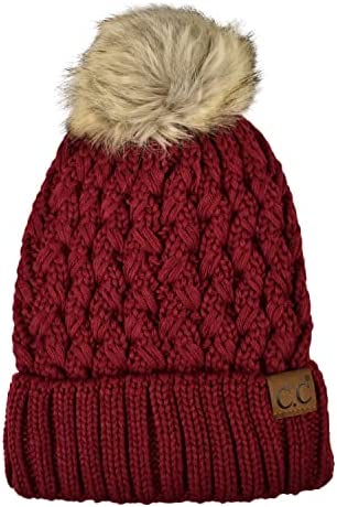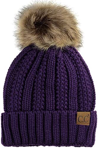 C.C Thick Cable Knit Faux Fuzzy Fur Pom Fleece Lined Skull Cap Cuff Beanie