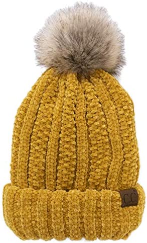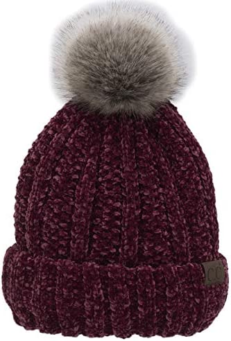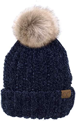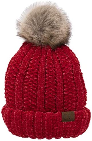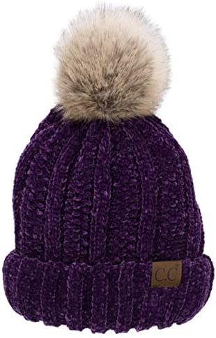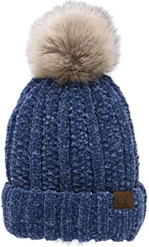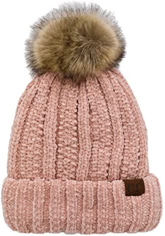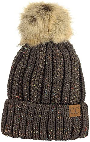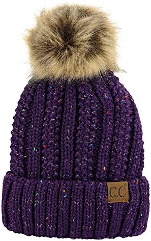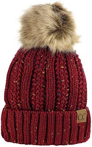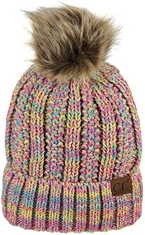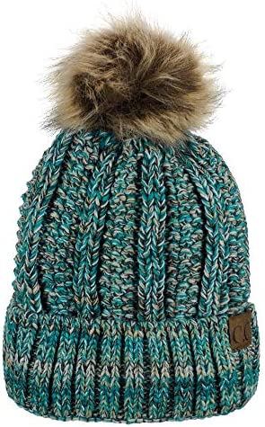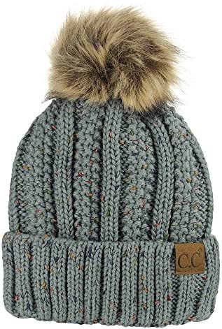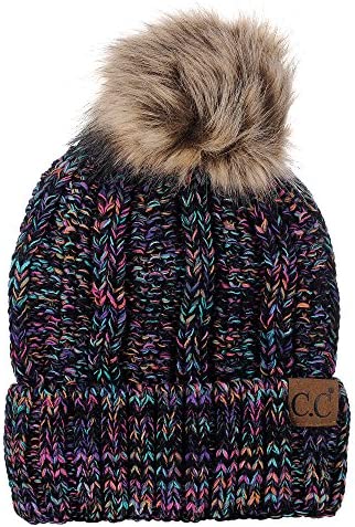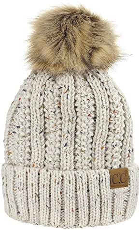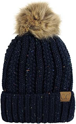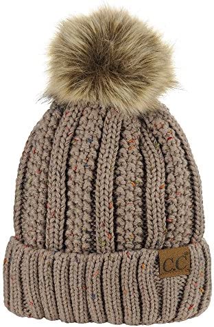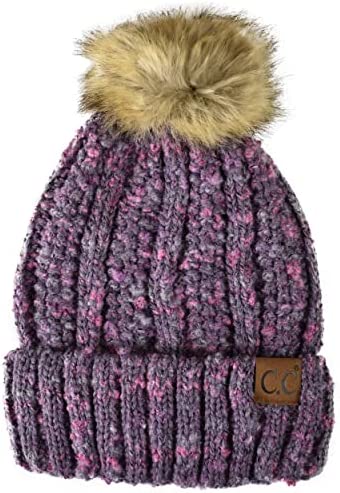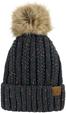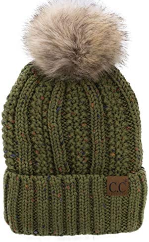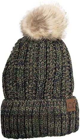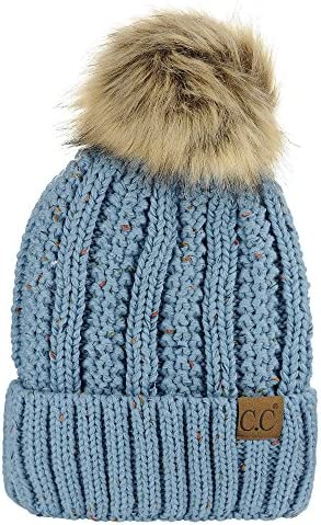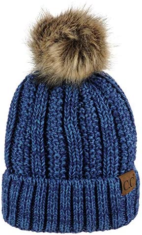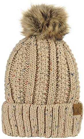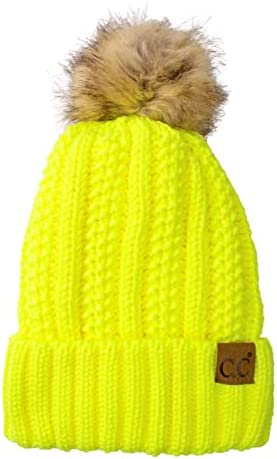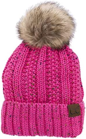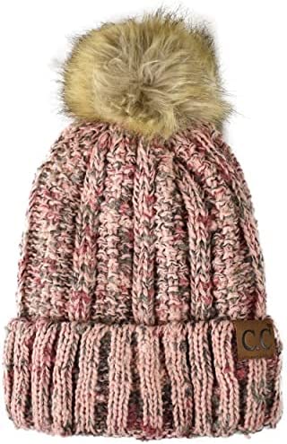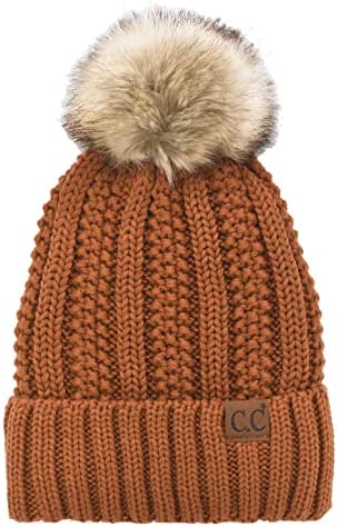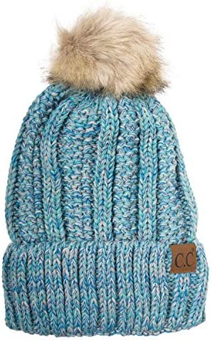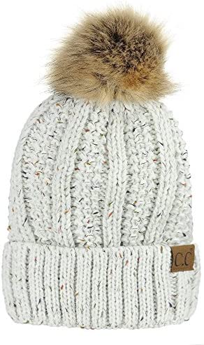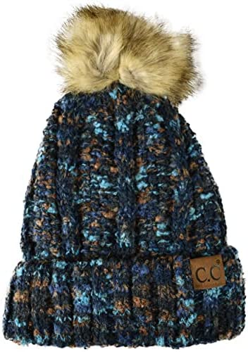 C.C Thick Cable Knit Faux Fuzzy Fur Pom Fleece Lined Skull Cap Cuff Beanie