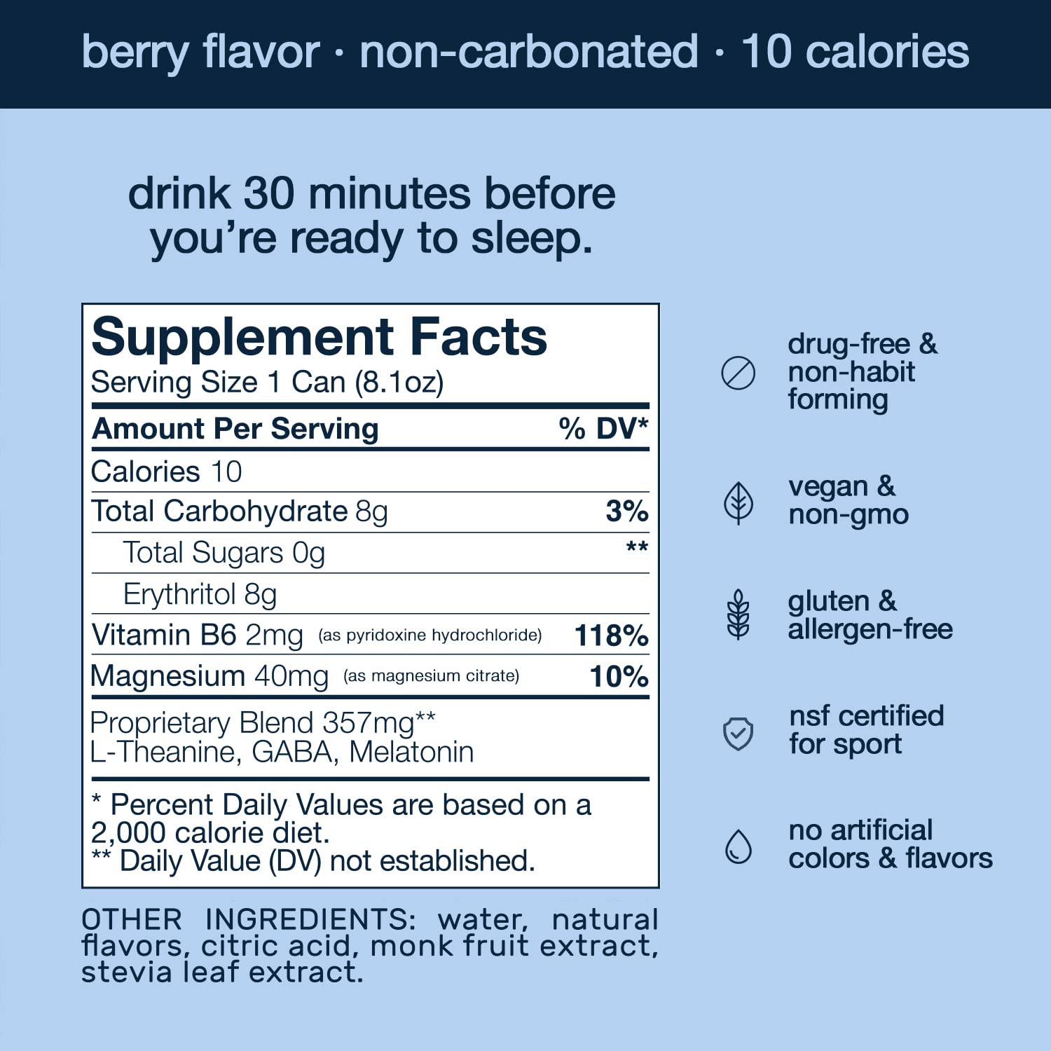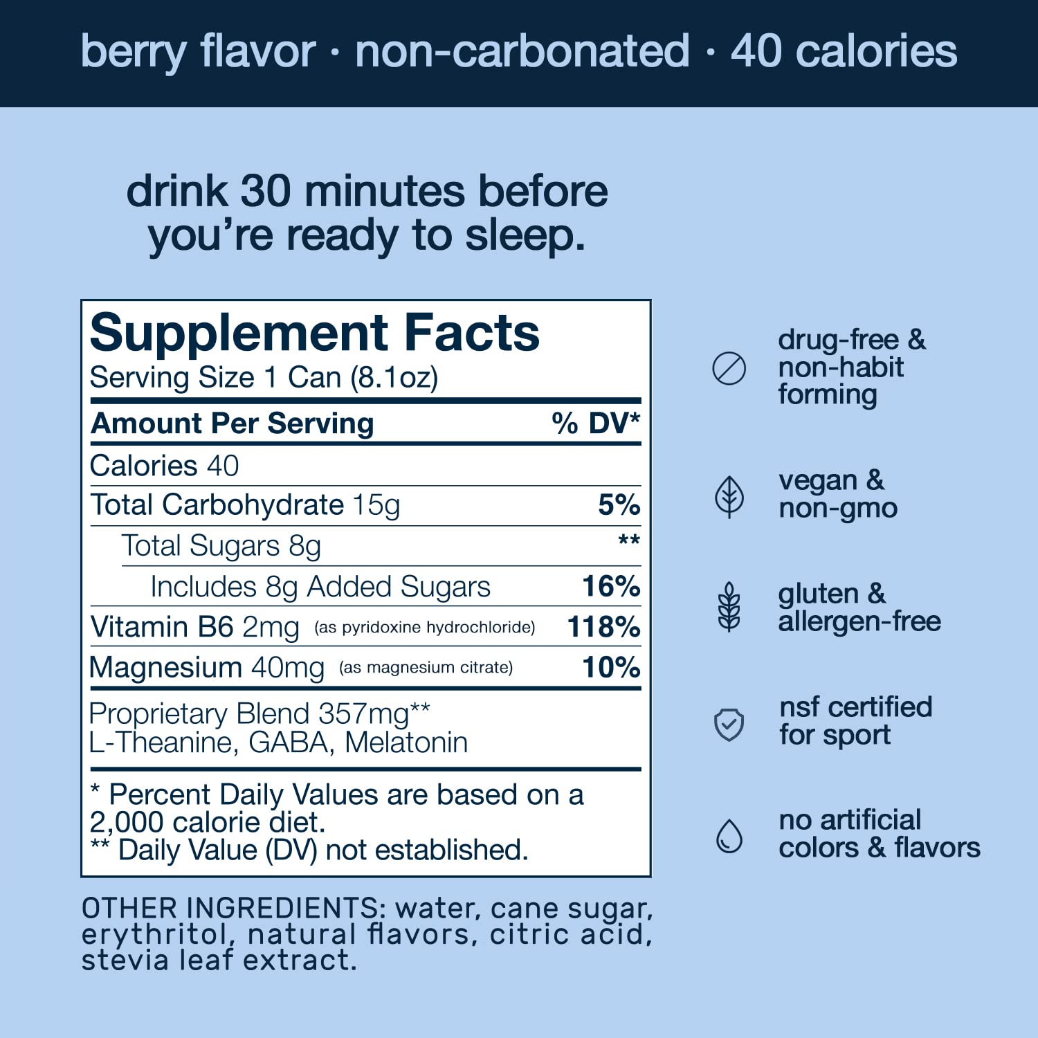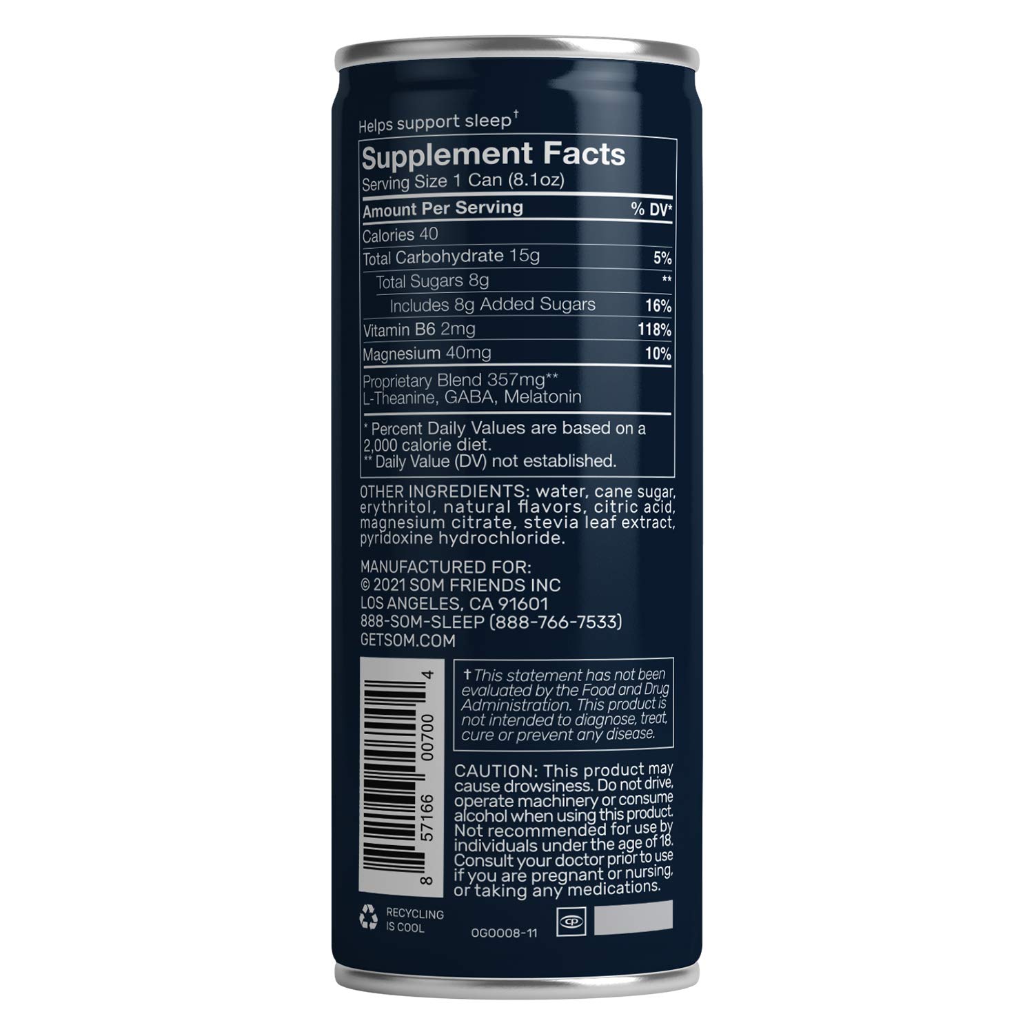 • Som is drug-free & non habit-forming. It's low calorie, sugar-free (Som Sleep Zero Sugar), Non-GMO Project Verified, & vegan. Som is free of gluten, dairy, soy, allergens, preservatives, & artificial flavors & colors. It's also NSF Certified for Sport.
