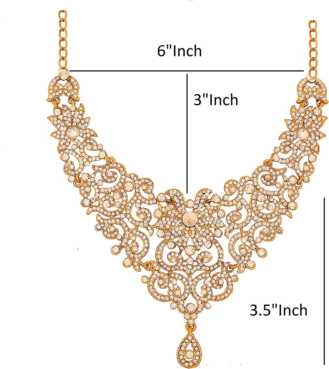 Touchstone Indian Bollywood traditional royal look attractive filigree carving white Rhinestone grand bridal designer jewelry necklace set for women in antique gold tone EXTRA LONG EARRINGS. Length 4 inches SPECIFICATIONS : Necklace circumference 8 inches with adjustable/extendable soft tassel. Earring weight (single) 18 gms. Earring length 4 inches. Earring width 1.25 inches. This is in a special dark gold plating to recreate the look of antique jewelry.