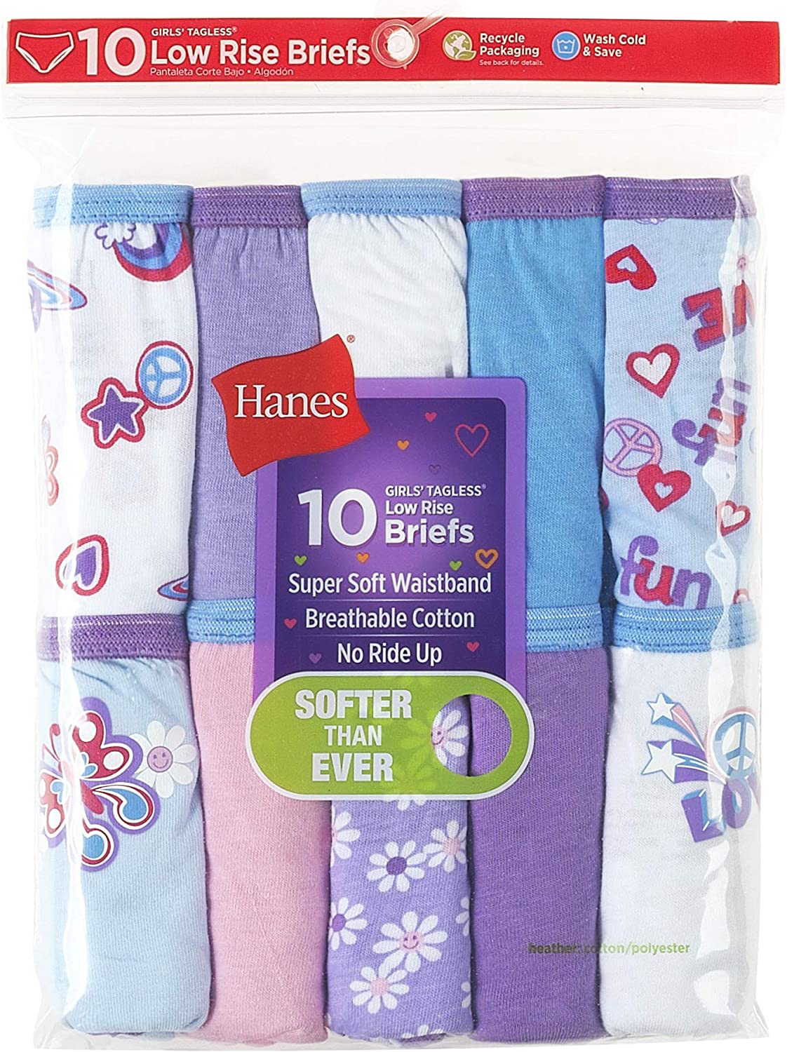 • VALUE 20-PACK – Stock up and save money. This value pack includes 20 pairs of Hanes girls’ underwear in assorted colors and playful prints.