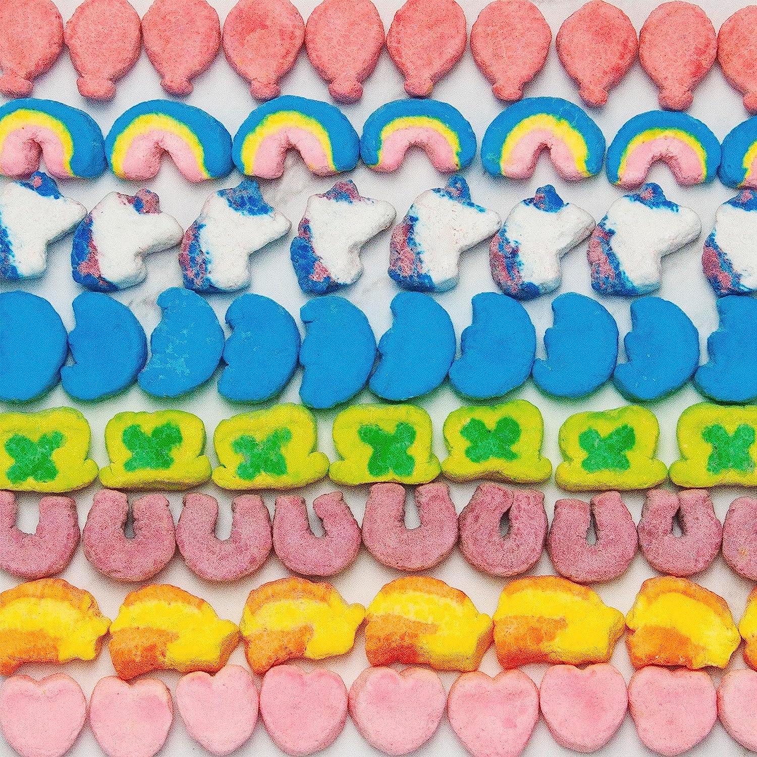 Several pieces of Lucky Charms marshmallows on a multi-color background.