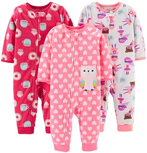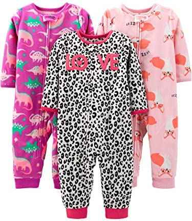 - Three sets of footless pajamas featuring fun patterns and appliques