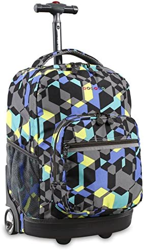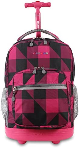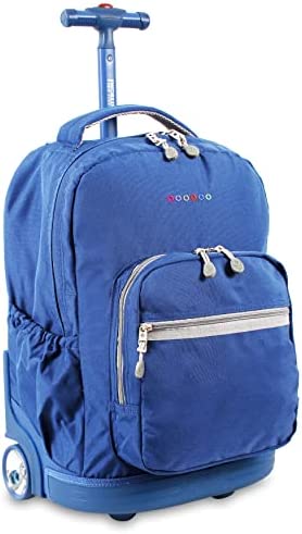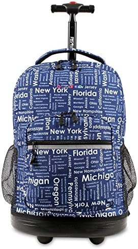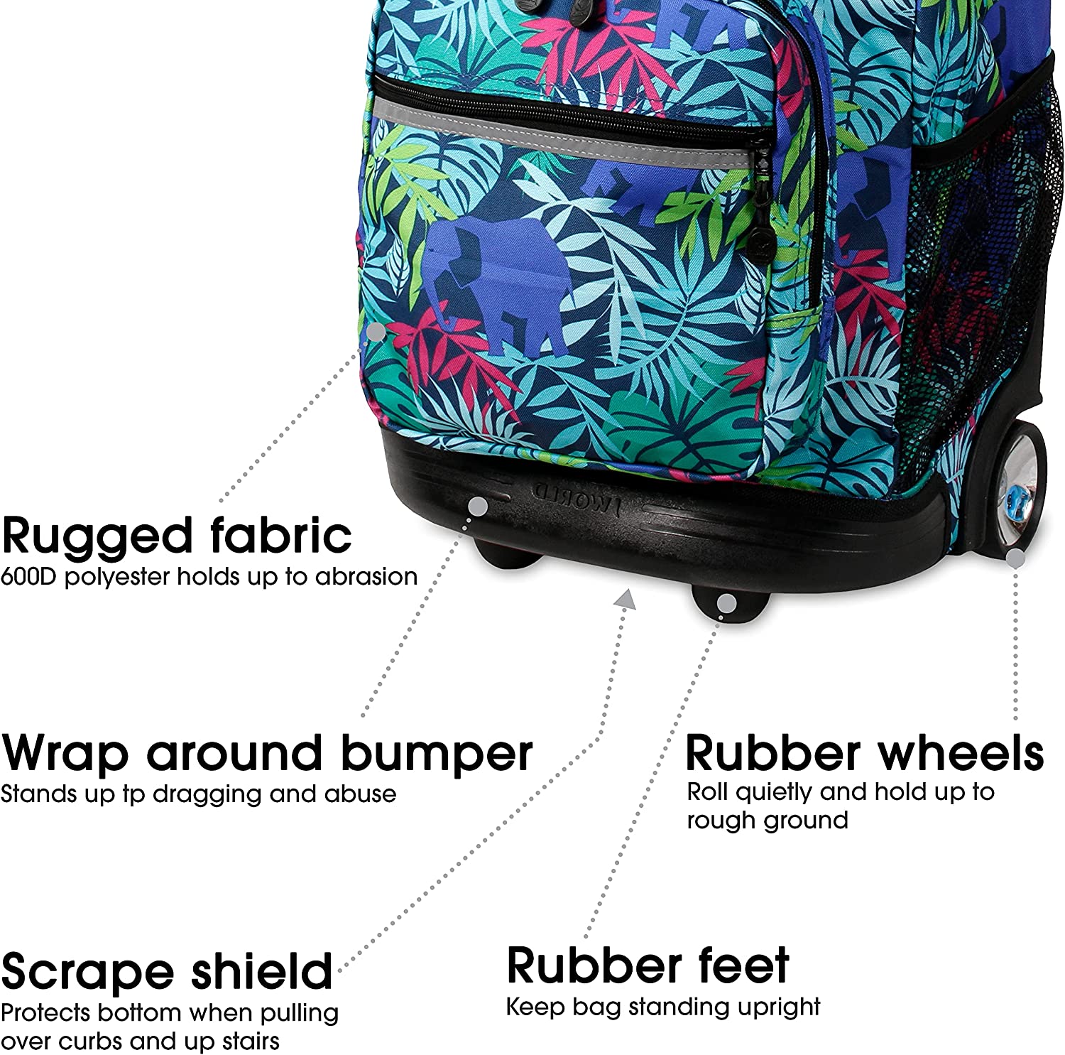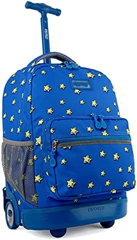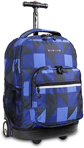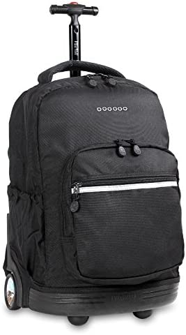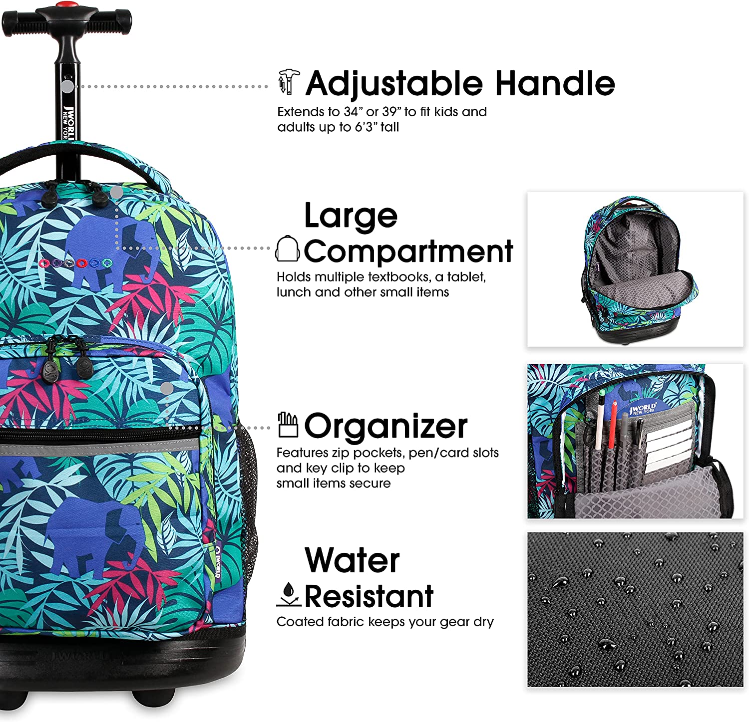 This rolling backpack for women and men converts from a rolling back on wheels into a wearable backpack with shoulder straps. Features a large main compartment, 2 mesh side pockets and a front pocket organizer. Measuring 18 x 13 x 9 inches, this backpack is also designed to be used as an underseat carry on bag for airplane travel. The single-tube aluminum handle extends to 34 or 39 inches for easy maneuverability by kids and adults up to 6’ 3” tall. Telescoping handle stores nested in bag. Molded rubber bottom holds up to the punishment of dragging on pavement. No more holes in the bottom of your kids rolling backpack! Made of durable ripstop polyester fabric with a metal frame and reinforced edges, this rolling backpack for boys and girls has a water resistant coating to keep your gear dry. Reflective tape gives night visibility. Features cushioned air mesh shoulder straps and back pad, or use the padded handle to carry this rolly backpack for girls and boys. This bag with wheels for kids and adults quickly converts into a wearable backpack when going up stairs or over rough ground, just pull out backpack straps. To convert back to a rolling travel backpack, simply tuck the straps away in the back pocket—no having to unzip. Large rubber backpack wheels roll and turn effortlessly on sidewalks, paths and airplane aisles. Corner mounted wheels provide extra stability. Our Promise - at J World New York, we stand behind our products 100%. If you have any issues with this rolling backpack for girls and boys, we will make things right