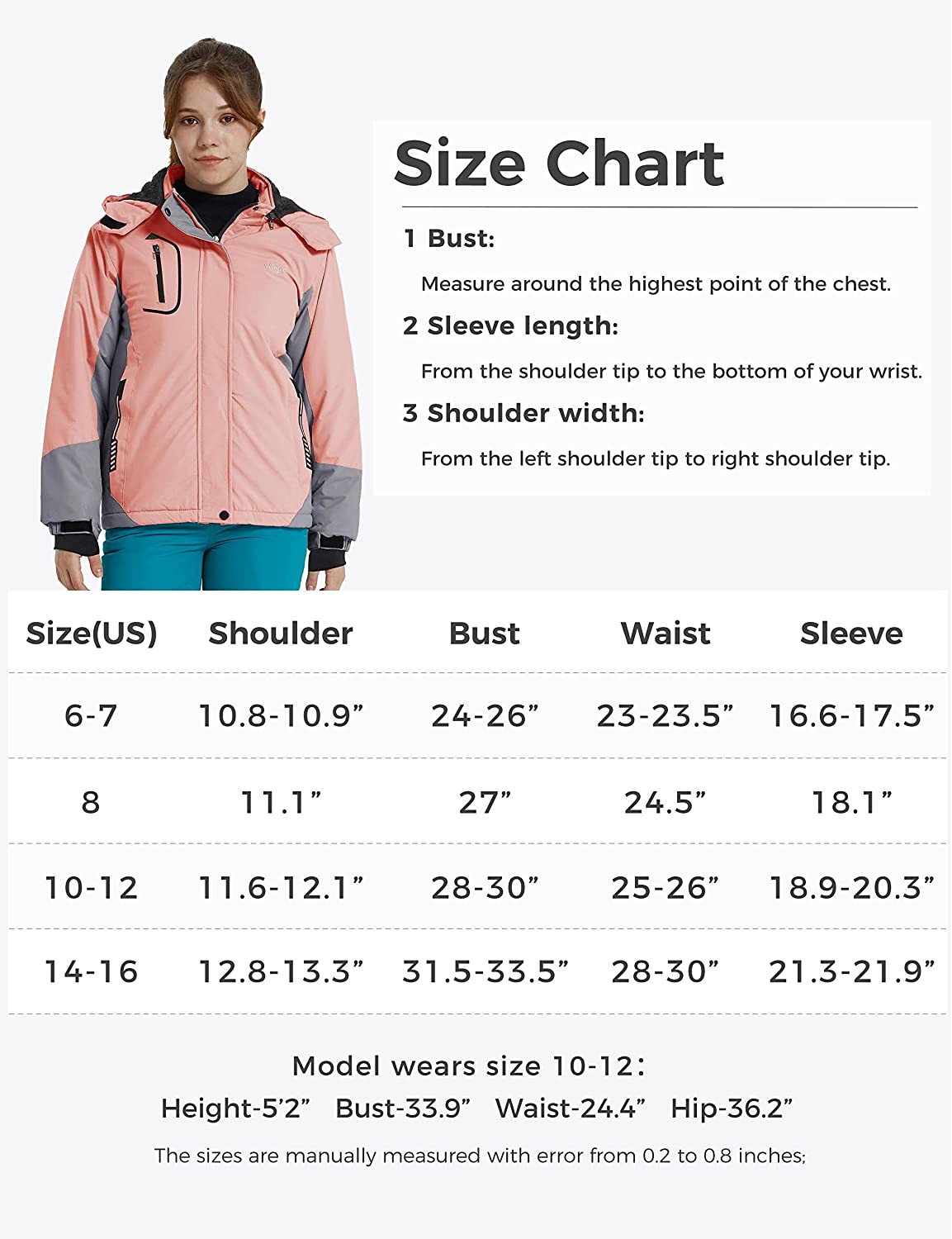 Keep Waterproof but Dry - With a 10000mm waterproof repellent coating, this kid girls' winter coats is great for keeping your child dry during skiing or snowboarding. Plus, the windproof skirt on the girls' skiing jacket works to keep snow, snowflakes, and cold air from getting inside the jacket.