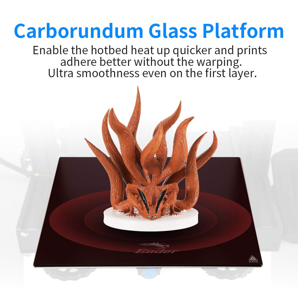• Carborundum Glass Platform: Enable the hotbed heat up quicker and prints adhere better without the warping. Ultra smoothness even on the first layer.