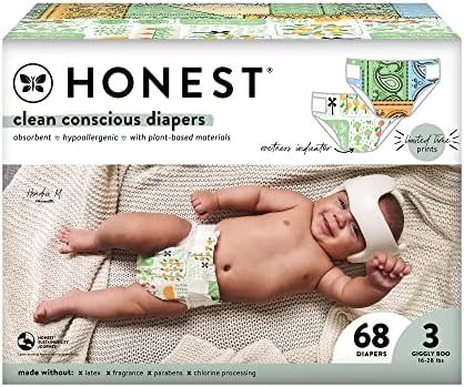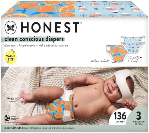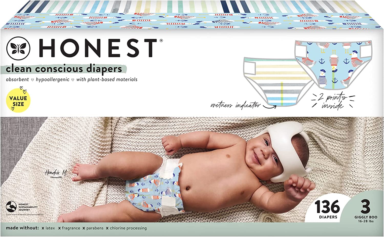 The Honest Company Clean Conscious Diapers | Plant-Based, Sustainable | Classic Stripes + Feeling Nauti | Super Club Box, Size 3 (16-28 lbs), 136 Count