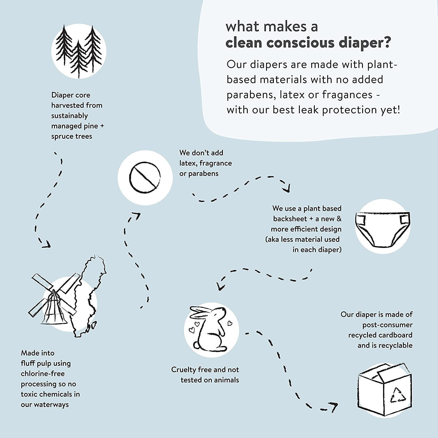 • Clean Conscious Diapers are designed with safe plant-based materials, a wetness indicator (so you know when it’s time for a fresh one), enhanced blowout protection, and advanced absorption for dry, happy babes