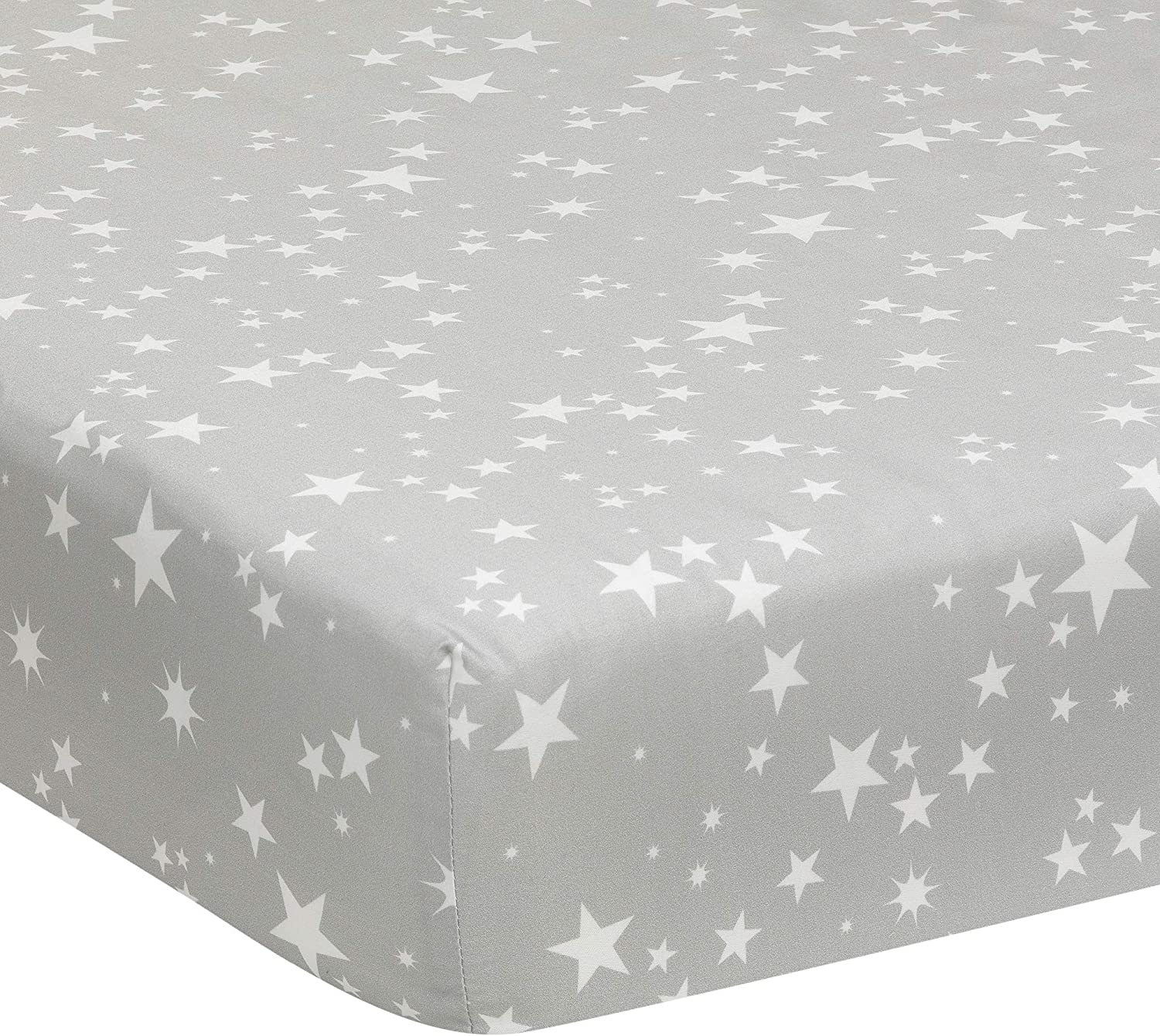 100% cotton fitted crib sheet and back of the quilt has multiple sized white stars on a pretty, gray ground