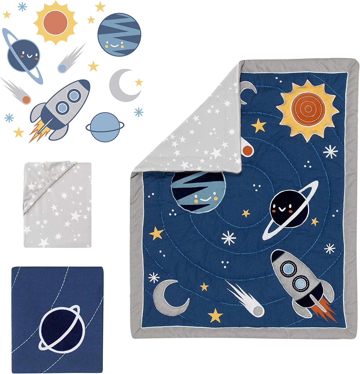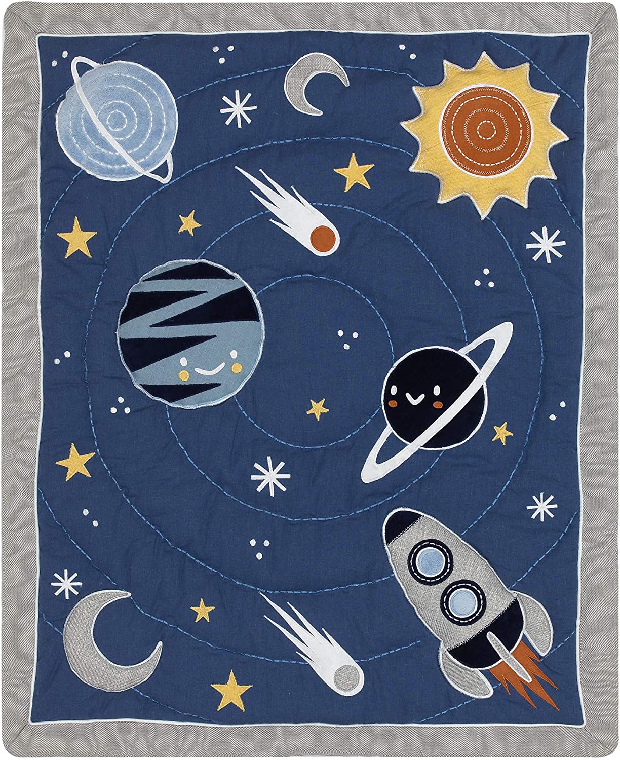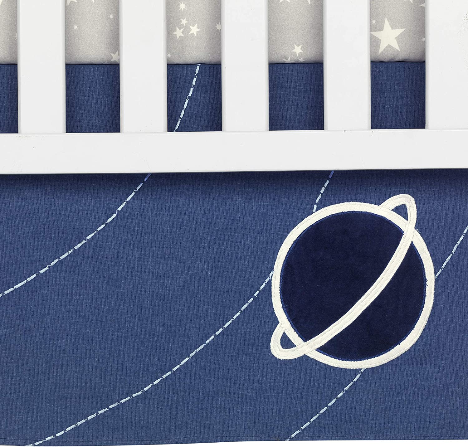 Crib skirt has a Saturn applique on the right corner