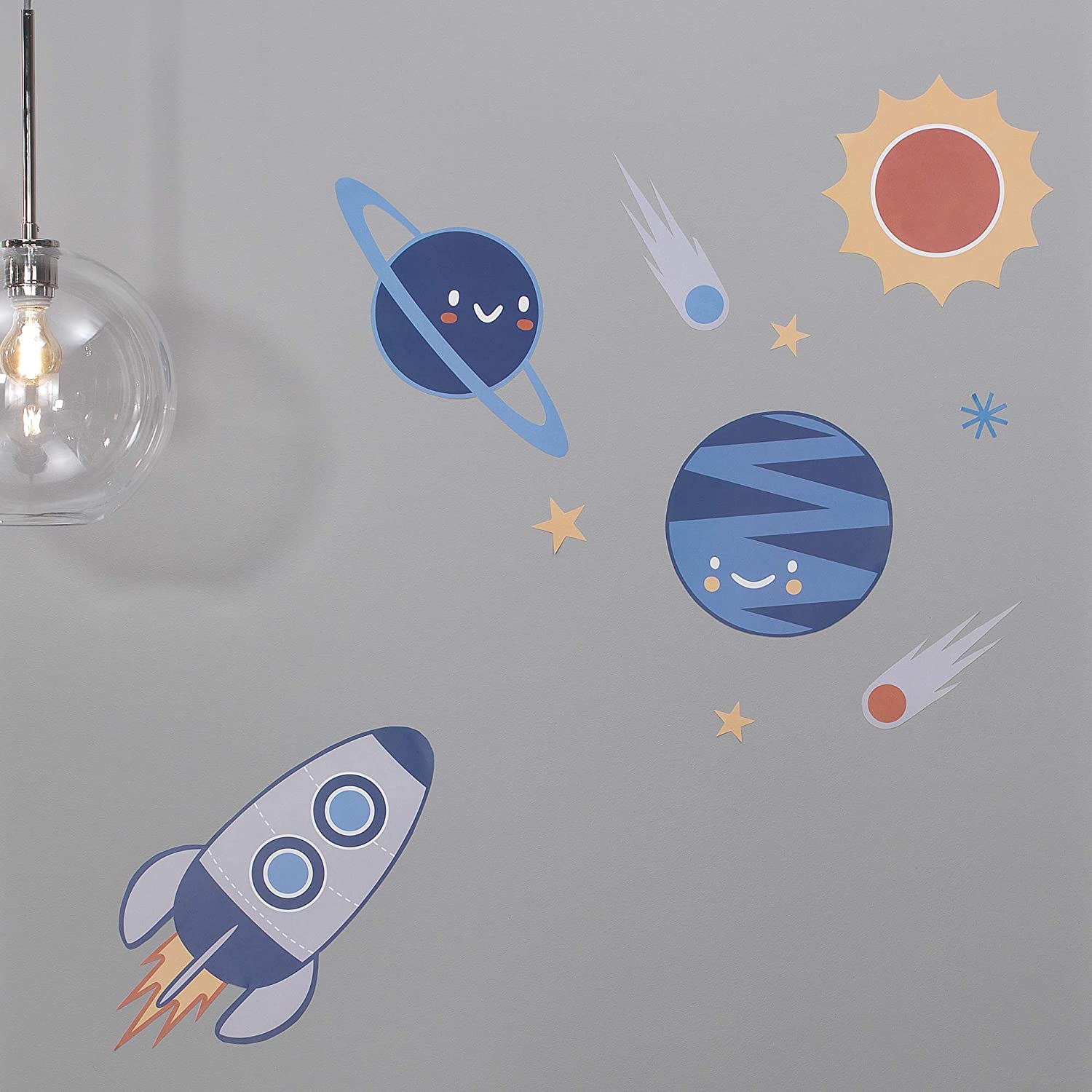 Colorful outer space galaxy theme wall appliques feature the planets, sun, moon and a rocket ship