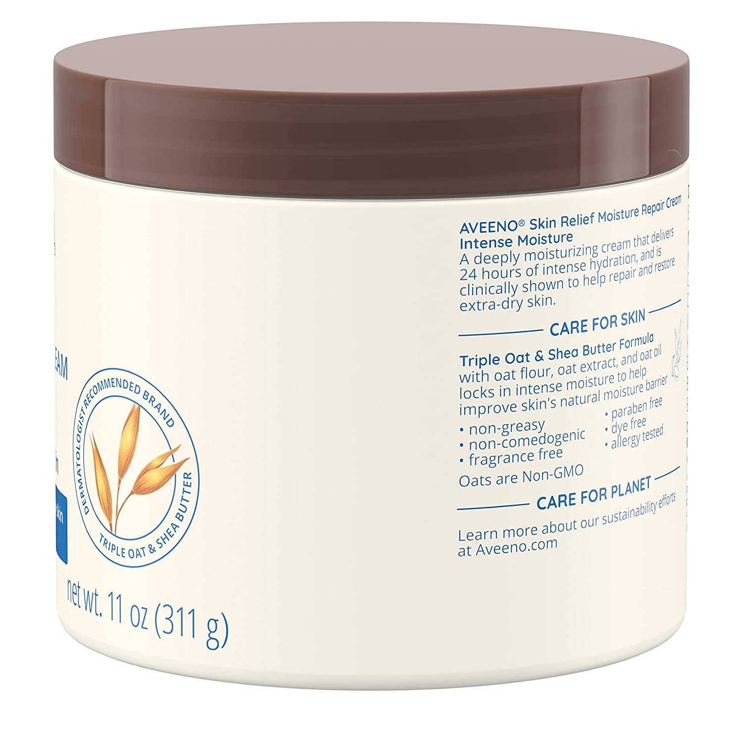 - 11-ounces of Aveeno Skin Relief Moisture Repair Body Cream with a Triple Oat and Shea Butter formula is fragrance-free and helps relieve and restore extra-dry skin with long-lasting moisture
