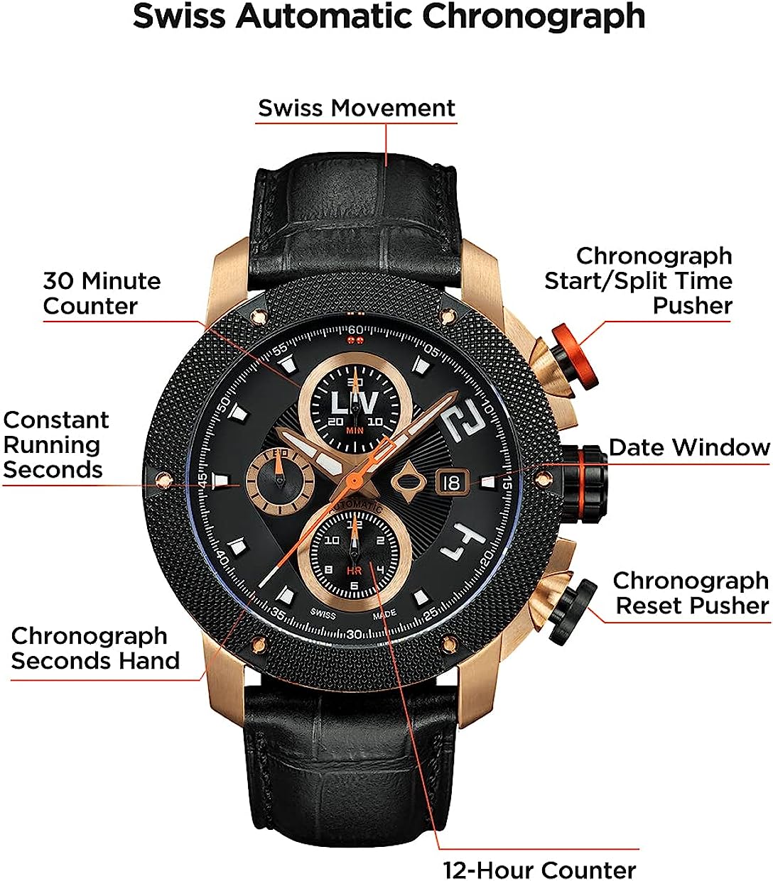 WATCH MOVEMENT: The LIV GX-AC is powered by a super-accurate 25 Jewel, ETA 7750 Swiss mechanical automatic movement with a 42-hour power reserve and 12-hour chronograph. It has been one of the most promising movements in Switzerland in the past 100 years.