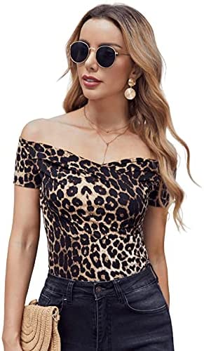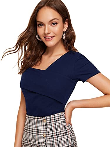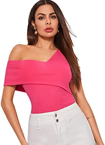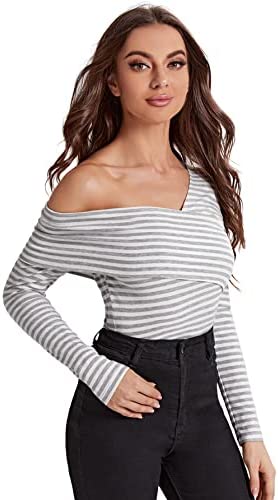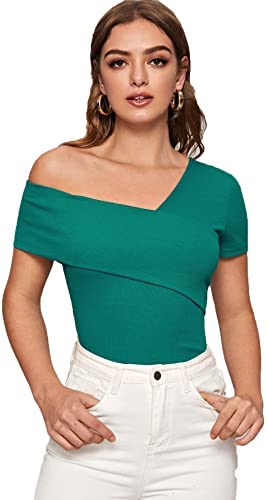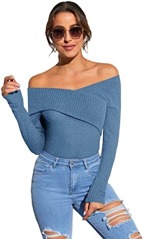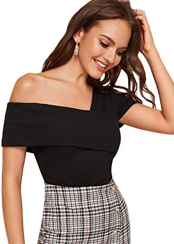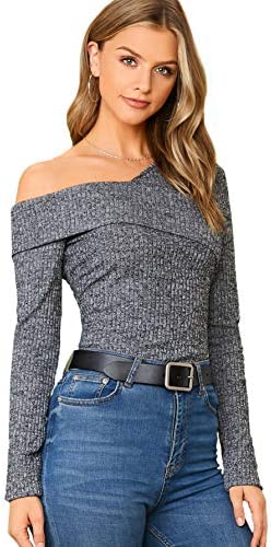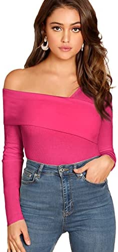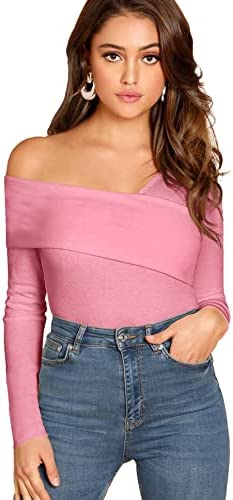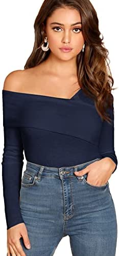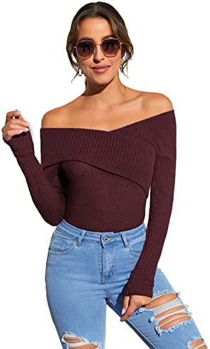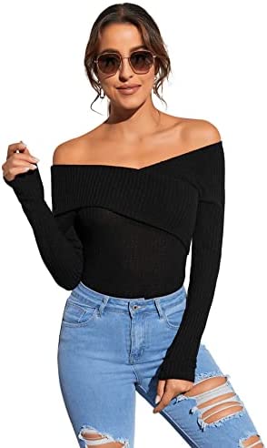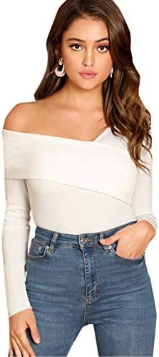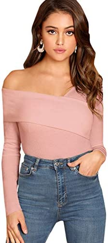 Romwe Women's Casual Cross Off Shoulder Deep V Neck Ribbed Knit Slim Wrap Tee Shirt Blouse