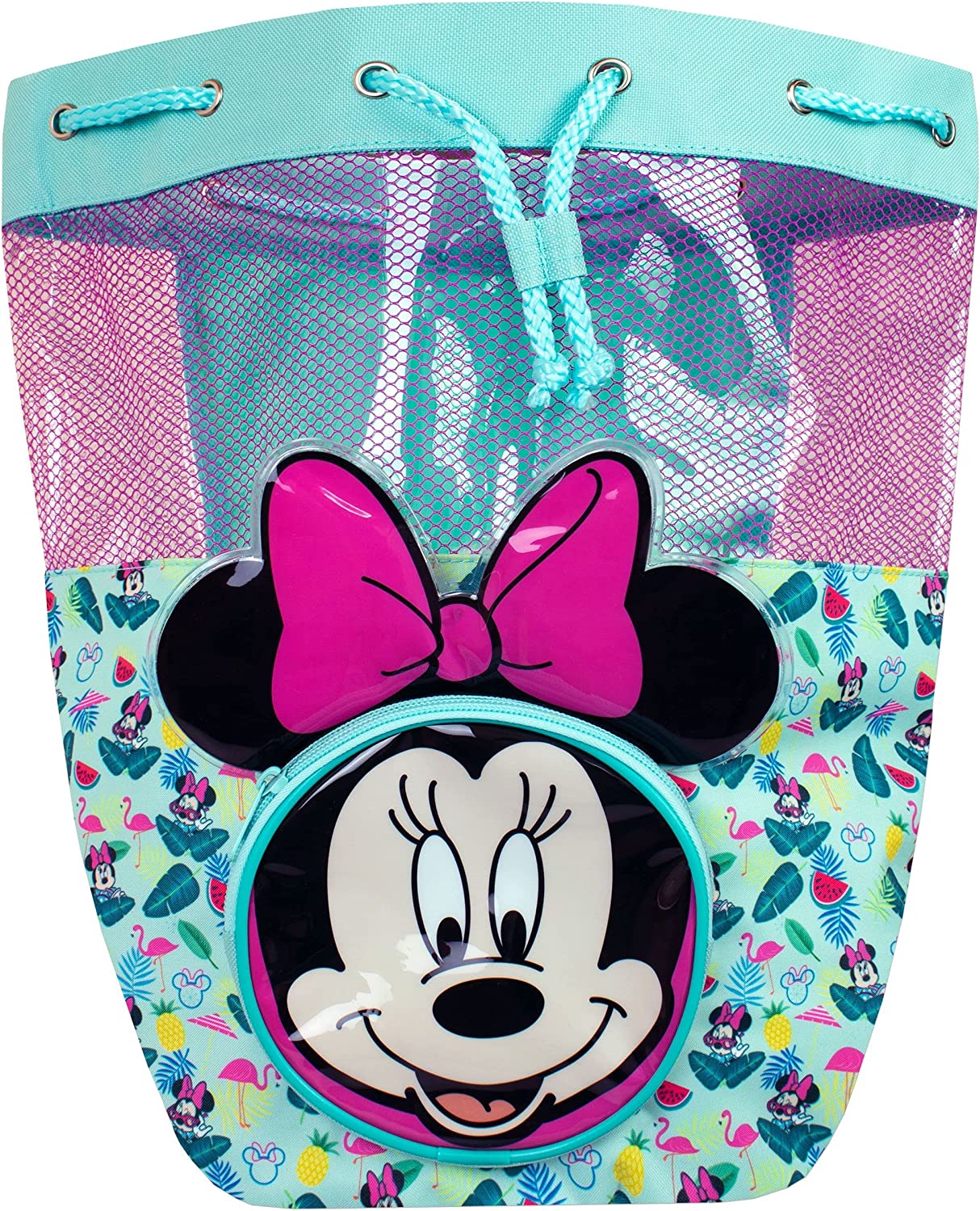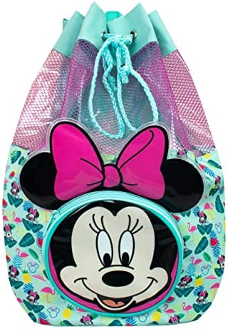 Girls Minnie Mouse Swim Bag. Your little Disney fan will be all set for a trip to the beach or pool with this bold Disney swimming bag featuring the Sensational Six starlet, Minnie Mouse! This blue and purple waterproof backpack has an easy drawstring fastening to the main compartment. The round zipped front pocket has Minnie’s face and adorable 3D ears and bow for a fun look.
