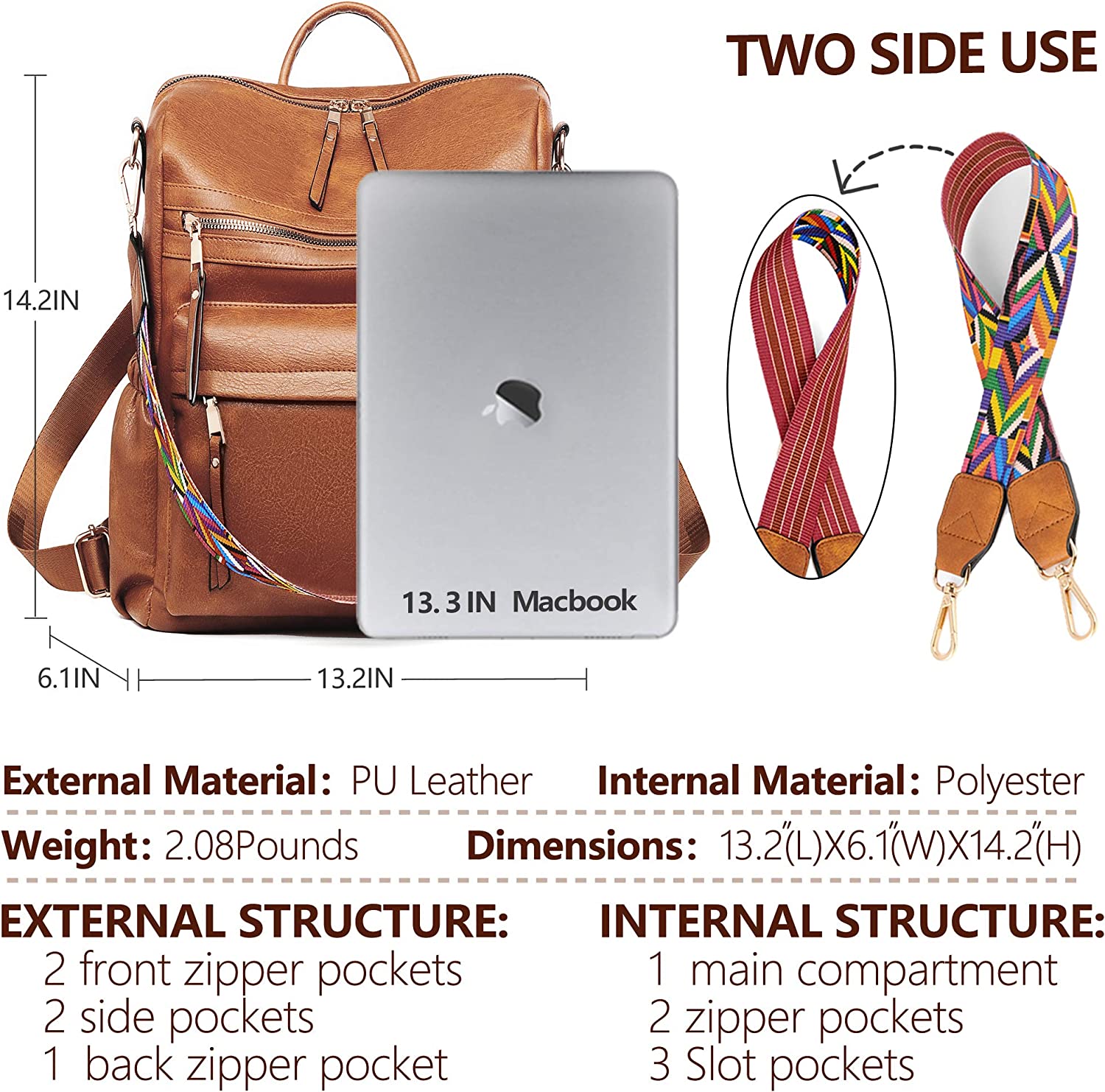 • LARGE SIZE & BIG CAPACITY - 13.2"(L) x 6.1"(W) x 14.2"(H), Detachable strap: 12.5"; Weight: 2.08 pounds. Roomy space could holds your 13.3” MacBook Pro, iPad, A4 files, folder, books, umbrella, water bottle, cosmetics and other everyday items. It’s also a perfect gift for Christmas, Valentine’s Day, birthday and anniversary.