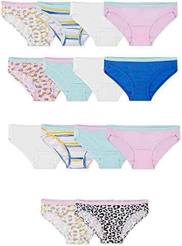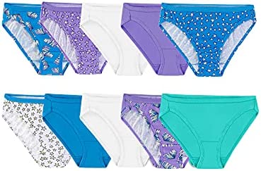 Introducing our improved cotton with extra softness, Fruit of the Loom girls' 10 pack bikini is the essential addition to her collection. This bikini is designed with breathable, 100% cotton fabric, a plush, ravel-free waistband, and soft, fabric-covered legs. The plush, ravel-free waistband is sure to hold up wash after wash and withstand her active lifestyle. This bikini has a slightly higher leg and a lower rise that offers mom-approved coverage. This assortment includes a combination of cute prints and fashionable solids. Offering a colorful way to meet her basic clothing needs, these bikinis come in a wide range of sizes making it easy to find the perfect fit for her. As always, our Fruit of the Loom girls' Panties are made tag free and with a 100% cotton liner for extra softness.