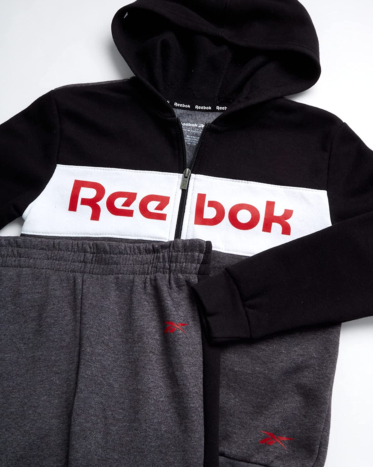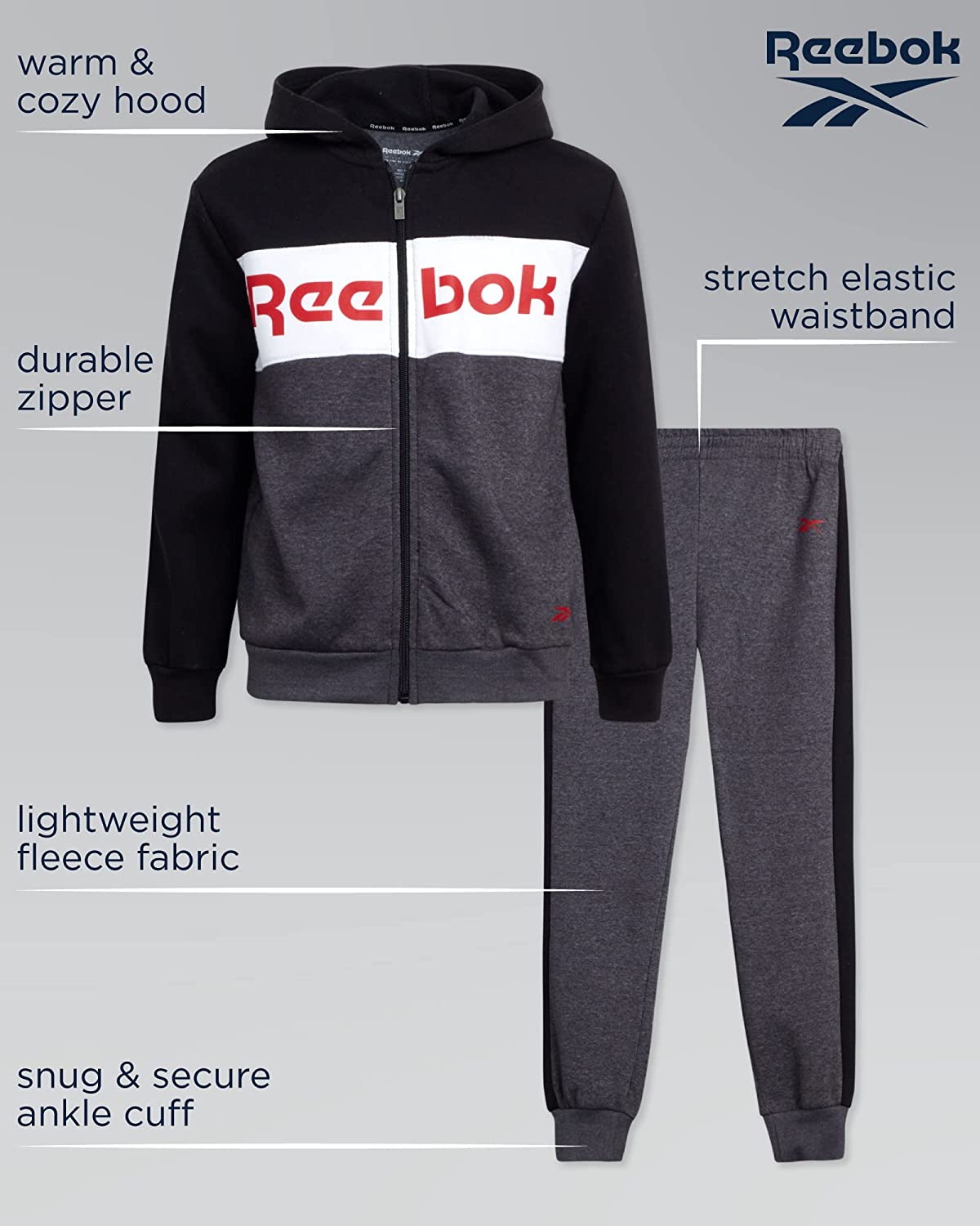 • OFFICIALLY LICENSED REEBOK: Boys' Sweatsuit Set with a Full Zip Hoodie and Jogger Pants; Greatness doesn’t come from standing still, Living an active life enables people to be their best selves