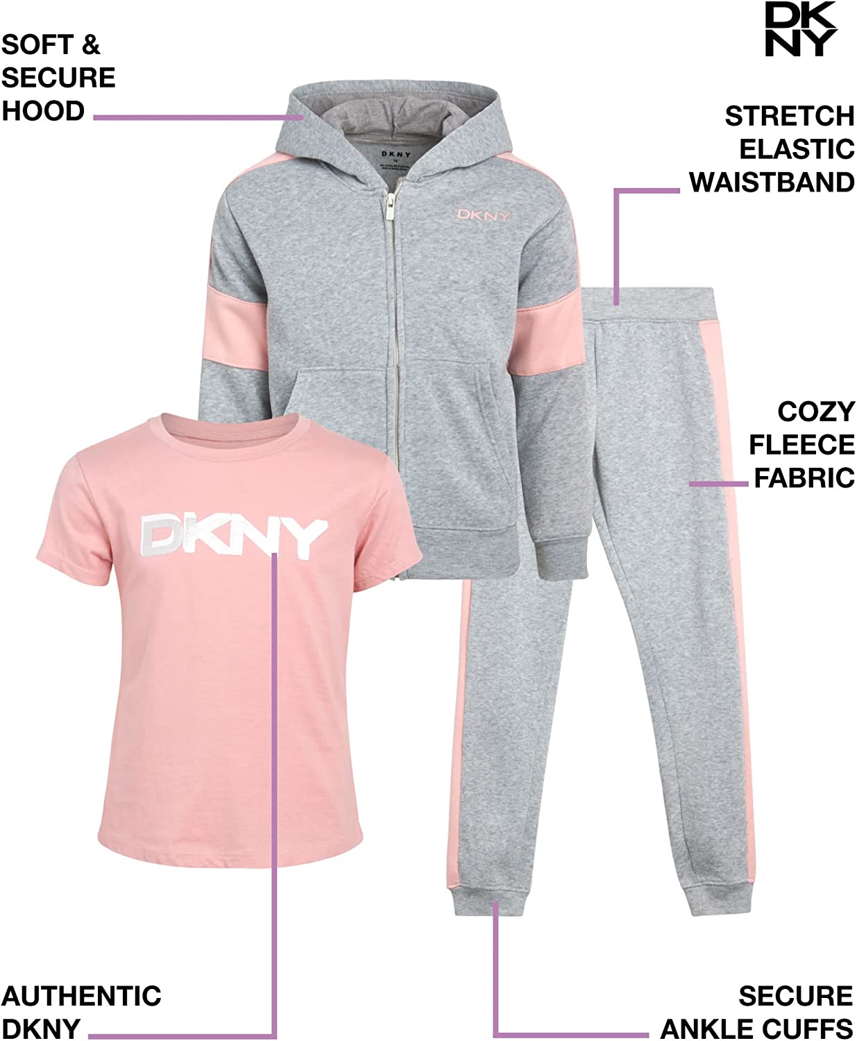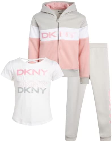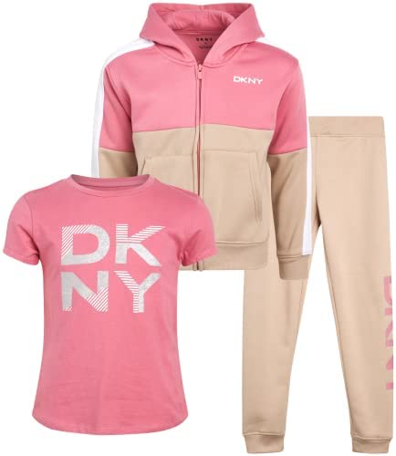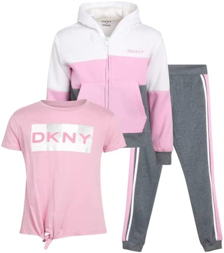 DKNY Girls 3-Piece Athletic Fleece Zip Sweatshirt Hoodie and Jogger Set