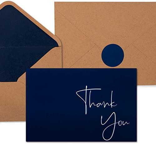 - ✔️ CLASSY DESIGN FOR ANY OCCASION: Each box set of 100 thank you cards come with matching lick-to-seal sturdy kraft envelopes with a blue interior lining as well as a matching themed sticker to seal the envelope and tie it all together. Be sure to always have a pack of greeting cards on hand, whether you need to thank a friend, send a special note, or make some staff appreciation cards!