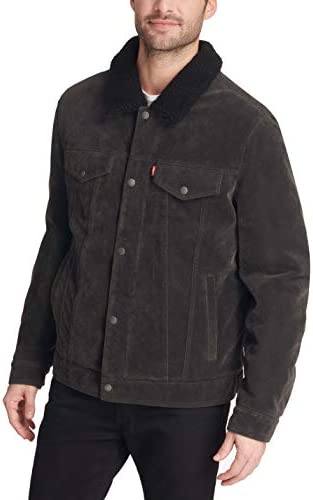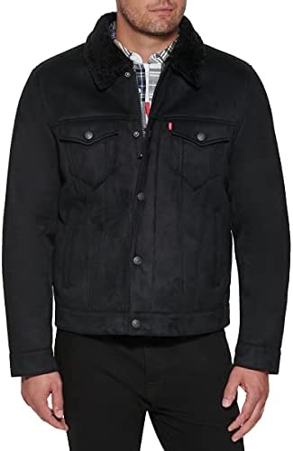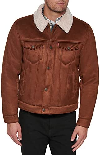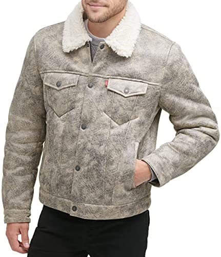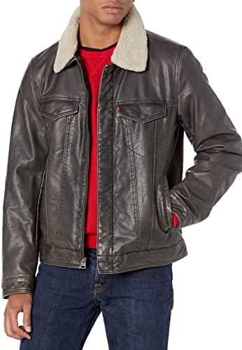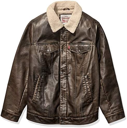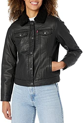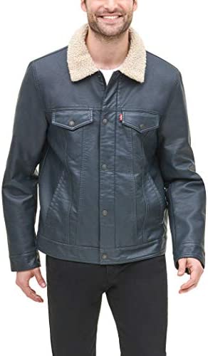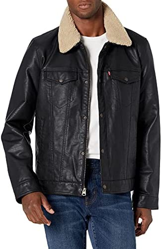 Classic trucker jacket in faux leather with red buffalo plaid lining, removable Sherpa collar, dual closure - zipper and snaps, adjustable snap cuffs, adjustable snap tabs on lower back, Levi''s red tab on left chest pocket, two chest flap pockets with snaps, two lower welt pockets and one interior welt pocket with snap closures.