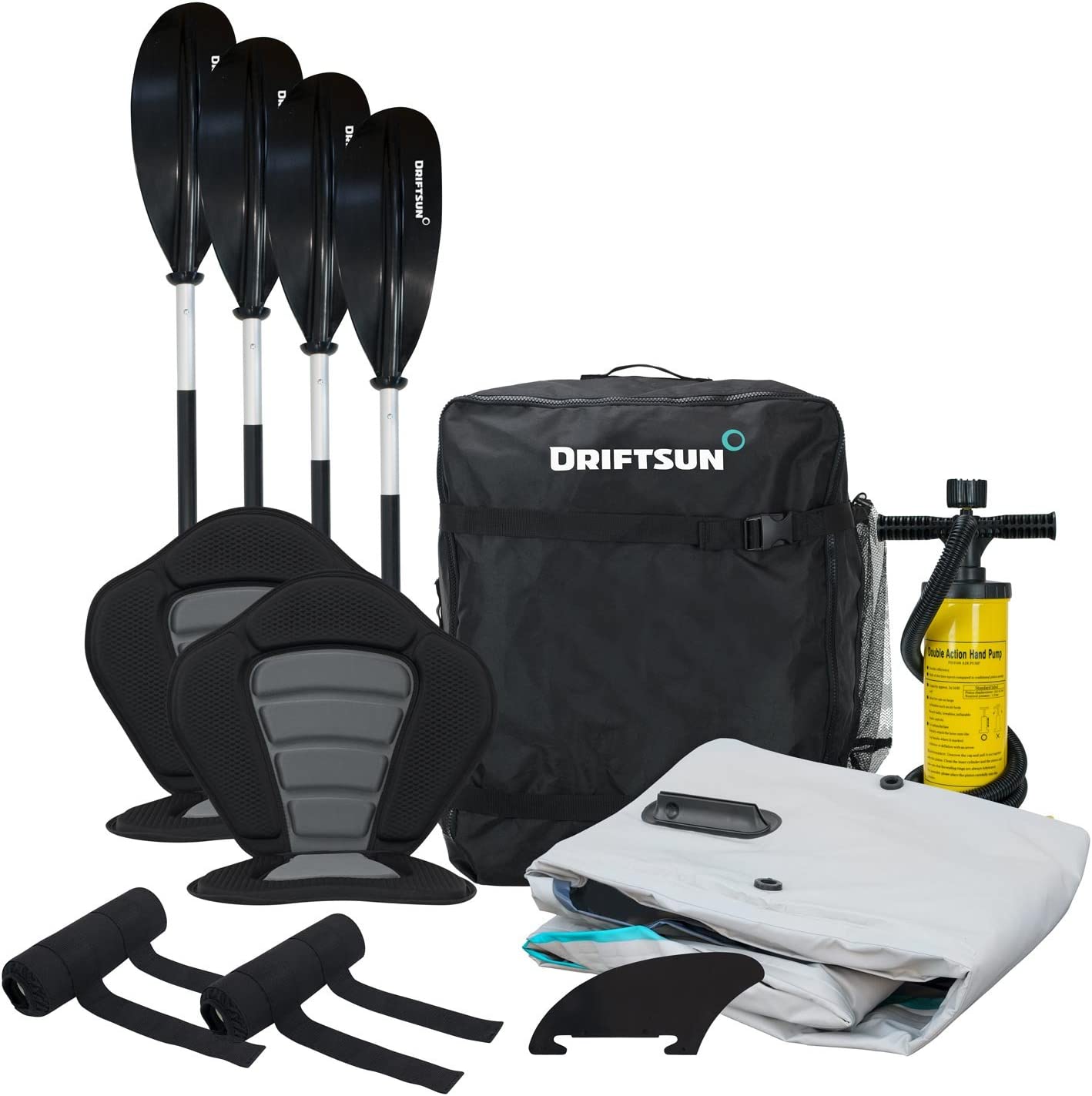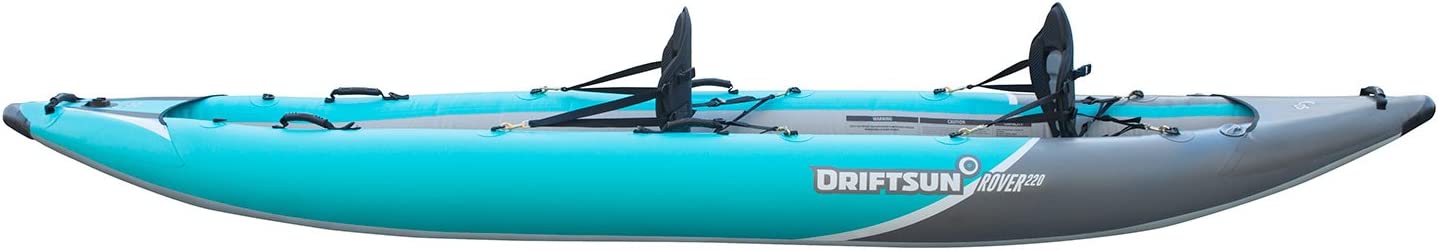 Paddle and ConquerThe Driftsun Rover 220 Tandem Inflatable Kayak is an adventure ready kayak for families and thrill seekers alike. This versatile two person kayak preforms exceptionally well in both flat and rough water. This package combines the highest quality materials, workmanship and top-notch accessories at an unbeatable price. Driftsun Inflatable Kayaks were born on the lakes and rivers of Northern California. Thoughtfully designed, constructed and tested by a team that lives to paddle.