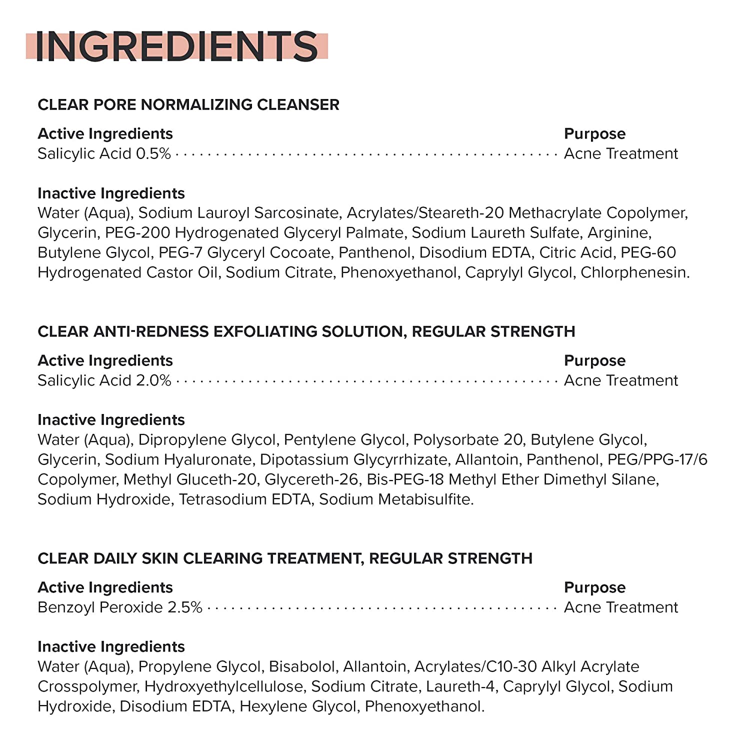 • Paula's Choice CLEAR Regular Strength Acne Kit contains 3 products: CLEAR Pore Normalizing Cleanser, CLEAR Regular Strength Anti-Redness Exfoliating Solution with 2% Salicylic Acid (BHA), and CLEAR Regular Strength Daily Skin Clearing Treatment with 2.5% Benzoyl Peroxide. It's suitable for normal, dry, oily & combination skin - including skin prone to cystic acne.
