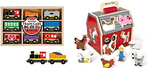 All aboard for some railroad adventures! Eight wooden train cars, each approximately three inches long, link together with magnetic couplers in endless combinations for lots of imaginative play. Brightly painted and beautifully crafted train cars include a steam engine, caboose, coal car, passenger car, and more. This set is sized to play perfectly with Melissa & Doug activity rugs or on its own. Pieces all store neatly in the compartmentalized wooden tray. This Melissa & Doug wooden toy set is made from high-quality materials. The sturdy train cars set provides unloading fun, and it’s easy for younger kids to use. Magnetic couplers link the cars together smoothly, making this a great toy set for building fine-motor skills and hand-eye coordination. This set makes a great gift for kids ages 3 years old and up, inspiring hours of hands-on, screen-free play. The Melissa & Doug Round the Rails Train Rug is a great add-on to give kids a dedicated space for imaginative play. For more than 30 years, Melissa & Doug has created beautifully designed imagination- and creativity-sparking products that NBC News called “the gold standard in early childhood play.” Today, Melissa & Doug is proudly partnering with the American Academy of Pediatrics to foster early brain development and help children build important life skills through play.