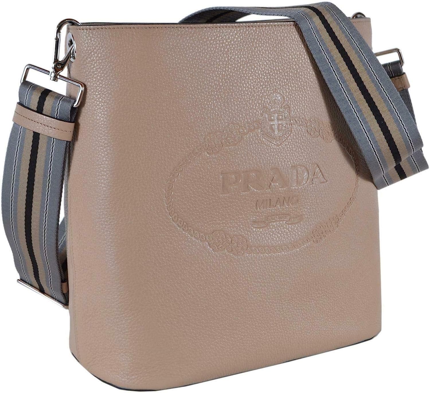 Prada Beige Logo Web Stripe Strap Pebbled Leather Crossbody Shopping Tote Bag 1BE023