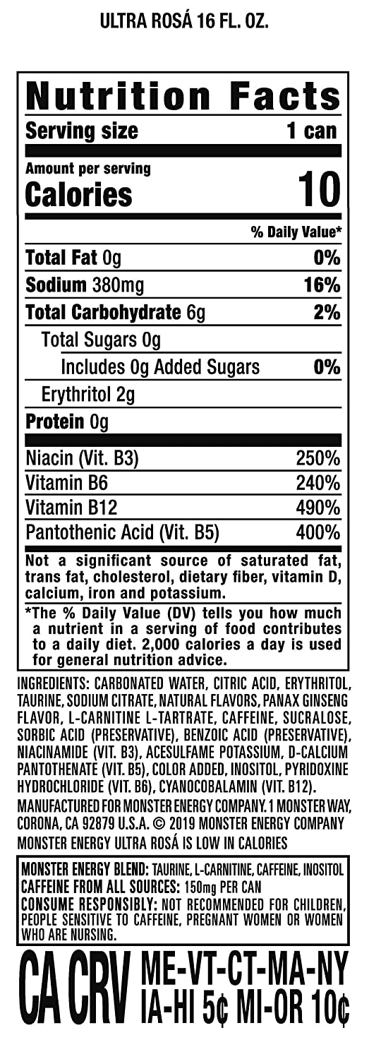 • FULL FLAVOR, ZERO SUGAR: Monster Energy Ultra Rosa has 10 calories and zero sugar, but with all the flavor you’re accustomed to and packed with our sugar-free Monster Energy blend
