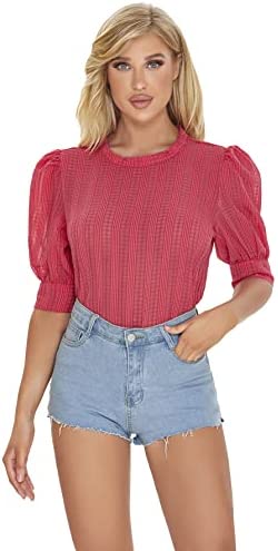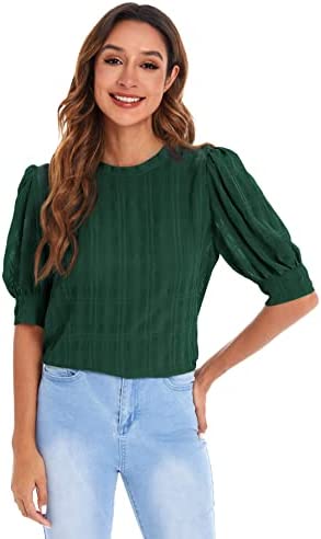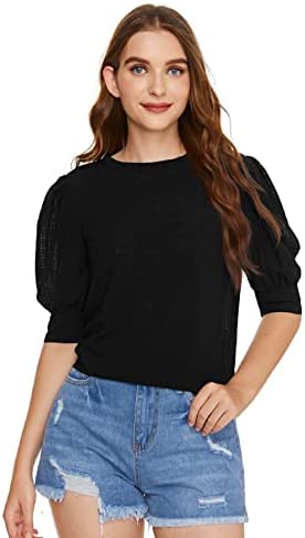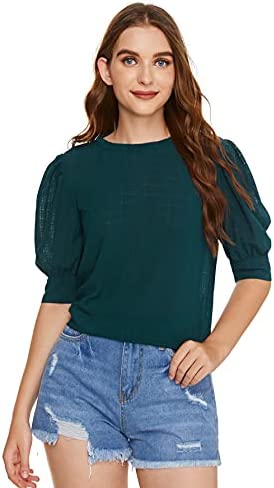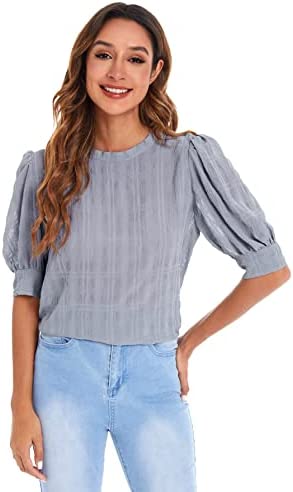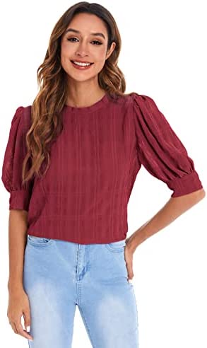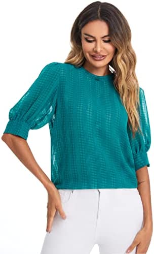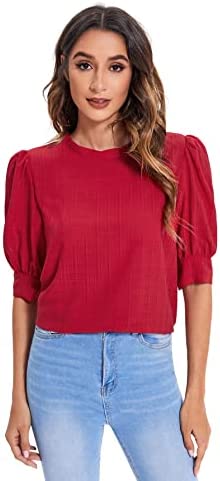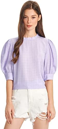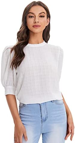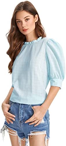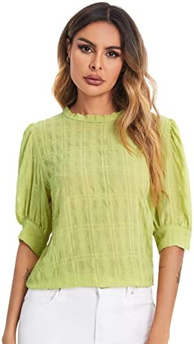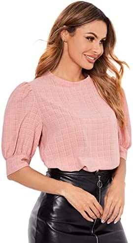 SheIn Women's Grid Office Blouse Work Top Puff Sleeve Shirt Blouses