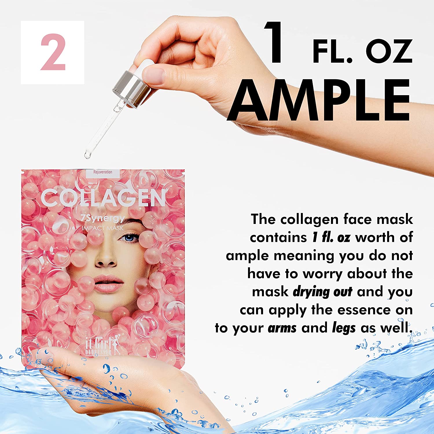 30ML AMPLE - The collagen face mask for face mask beauty contains 30ml worth of ample. A single face sheet mask that we provide contains 30ml, meaning that you do not have to worry about the skin care mask drying out or lacking essence as we try to give the most to our customers. The collagen mask contains enough essence for you so that you can apply the essence on to your arms and legs as well.