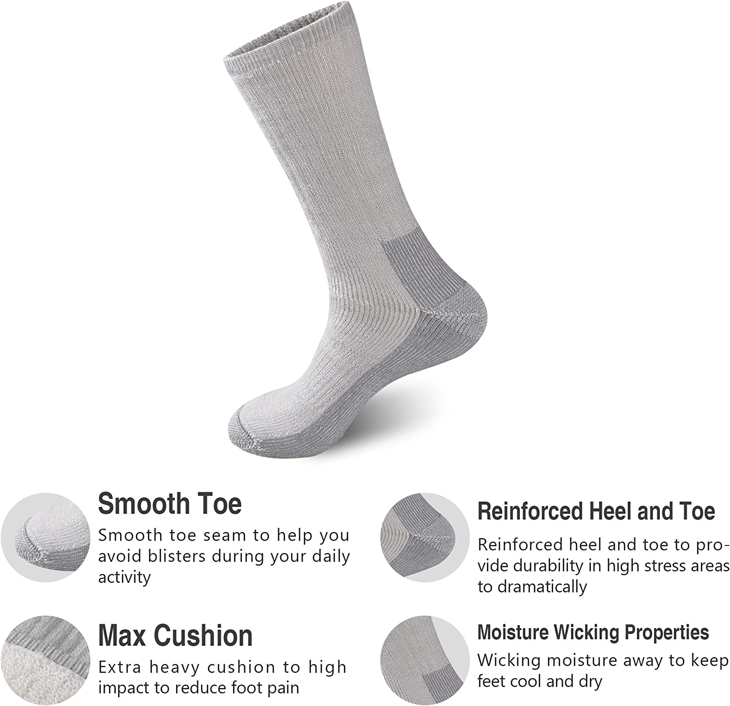 Our Wool cushion Crew Socks are reinforced with high-density fibers in heel and toe. cushioning in the foot area for added comfort, arch support hugs feet and keeps socks in place, while providing in-step support.It protects the foot from shear and prevents painful blisters.