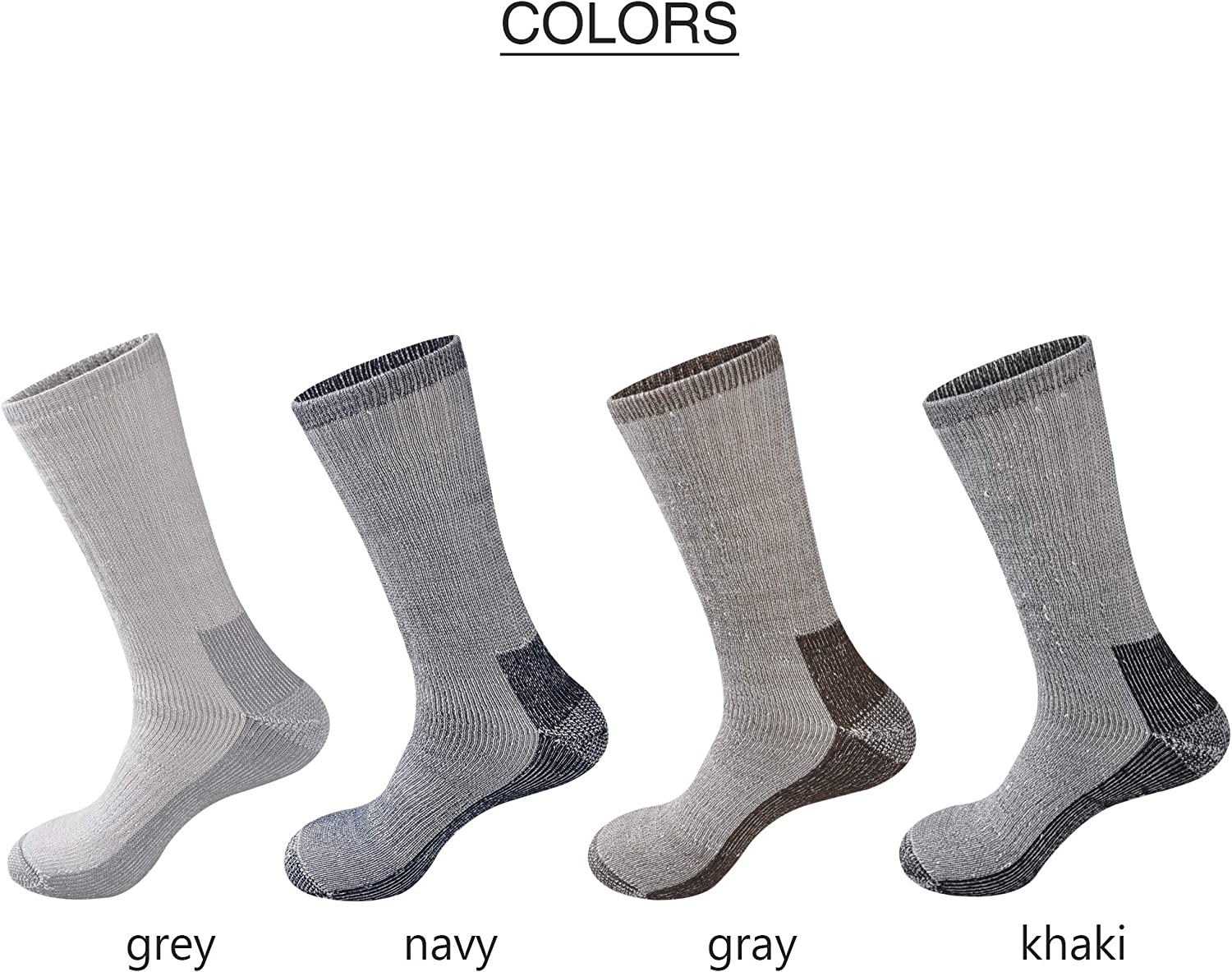 Merino Wool is a natural moisture management fiber that wicks moisture and Super soft to provides natural comfort for all seasons.Each pair is cushioned throughout and reinforced from heel to toe for maximum comfort and durability. These wool cushion crew socks designed for extreme weather conditions, great cold weather gear for outdoor activities and sports like skiing.