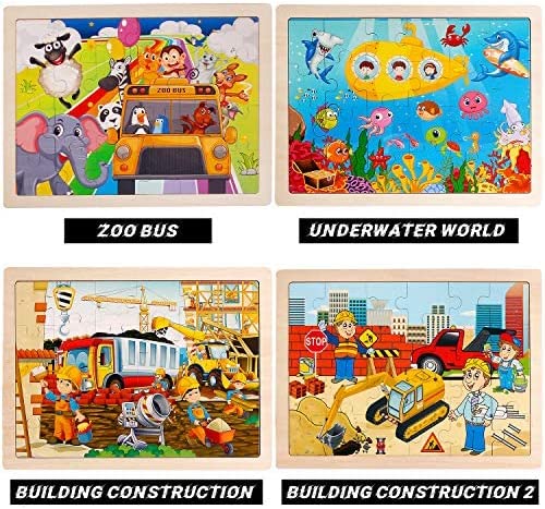 4 Packs 24 PCs Jigsaw Puzzles for Kids Preschool Educational Brain Teaser Boards Toys Animal Zoo Bus Marine World Construction Sites Children Enlightenment 3 Years Old and Up