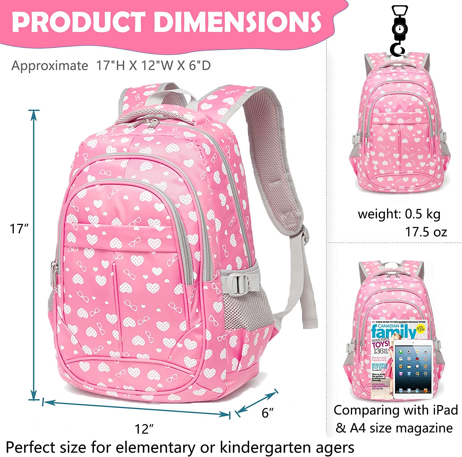 • ? 【 APPROXIMATE DIMENSIONS & LIGHTWEIGHT 】-- This girls backpack Dimension: 17"H X 12"W X 6"D. A lightweight and durable daypack that goes from school to fun as quickly as you do with the comfortable straight-cut padded shoulder straps, padded back panel, and a quick grab web haul handle .