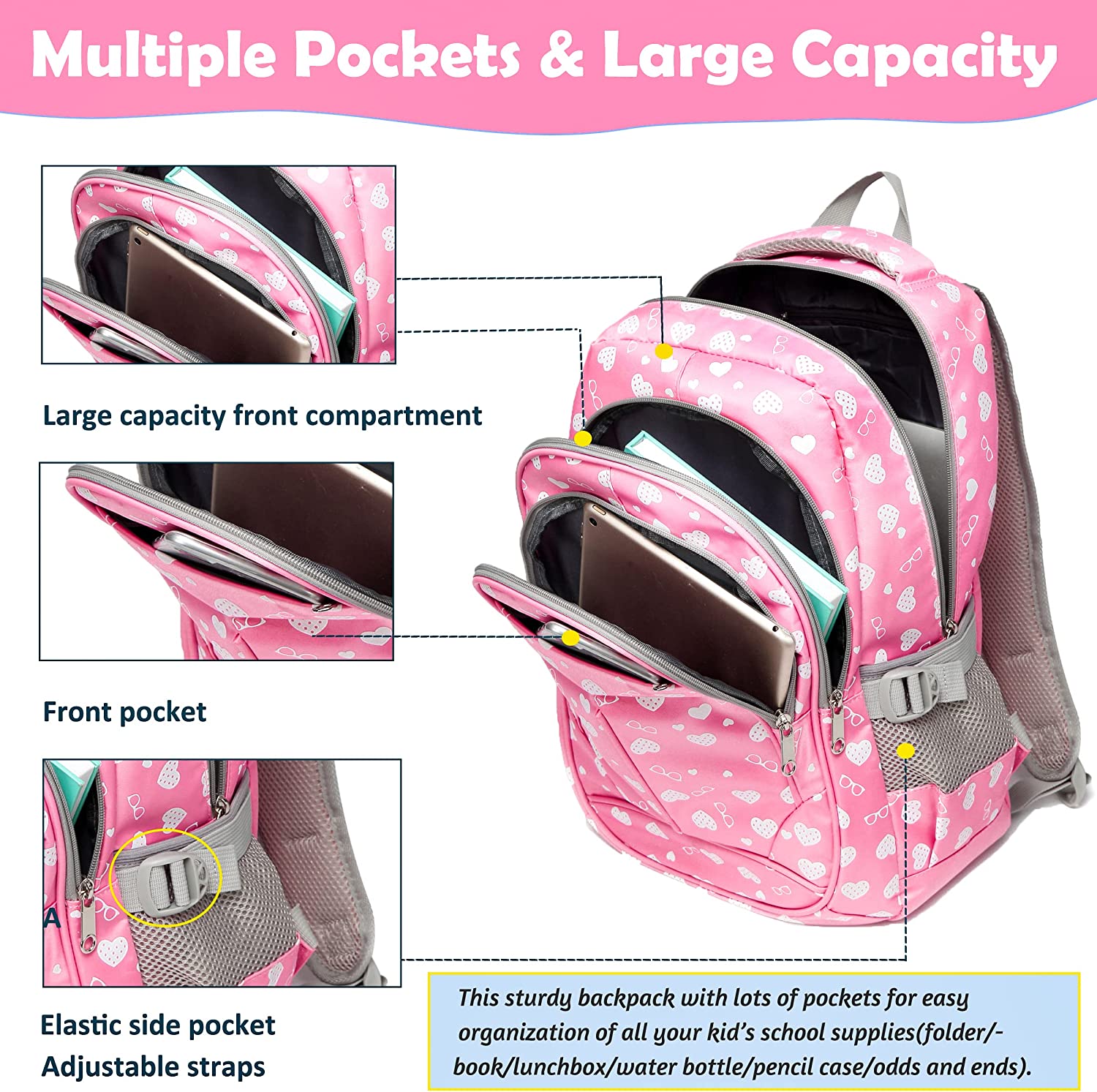 • ?【Very roomy with a lot of compartments 】--This backpack has large pocket which fits a folder/book/lunchbox. Second pocked also fits folder and book. 3rd pocket holds plastic pencil case. Smaller pocket for odds and ends.2 side pockets for water bottle.