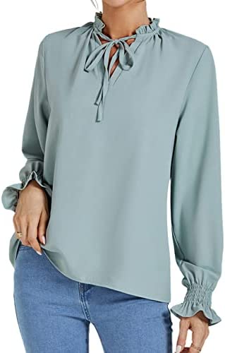 - Stand collar, regular fit, solid casual long sleeve frill neck blouse for women and girls.