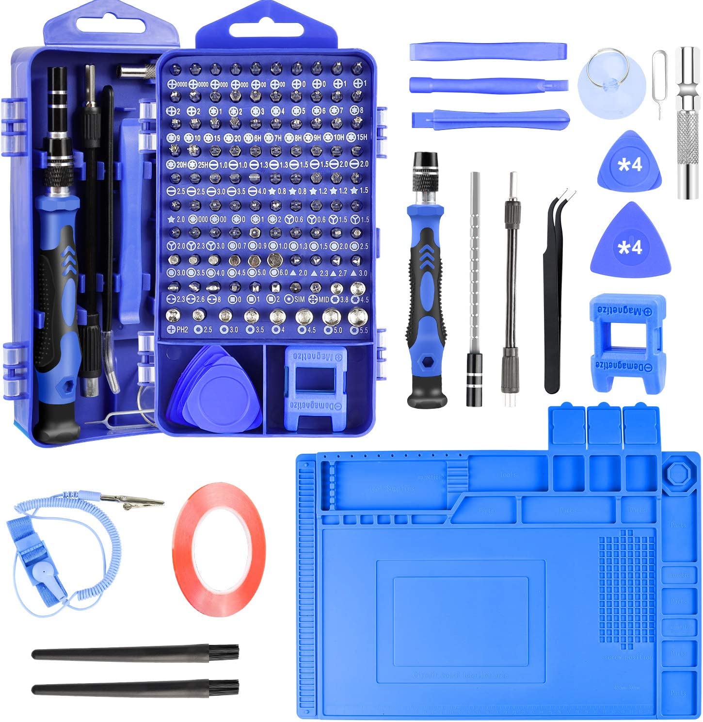【Magnetic Design】This professional screwdriver kit contains many magnetic tools. Anti-static pad, magnetizer, anti-static wrist strap, magnetic screwdriver, magnetic screw bits, this line of magnetic repair tools can keep all screws and small parts in order, prevent loss and clutter. And the resistivity value of the ESD mat between 10 ^ 6 - 10 ^ 9 ohms which can protect your sensitive electronic devices from static damage.
