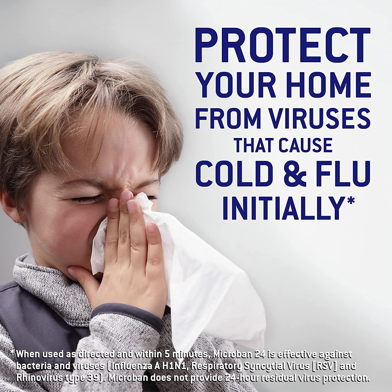 Microban 24 Hour Multi-Purpose Cleaning Spray keeps killing 99.9% of bacteria** for up to 24 Hours, even after multiple touches*, to support a clean and healthy home. This all-purpose sanitizing cleaner is great for every day messes and is suitable for use on all different types of non-food contact hard surfaces, like garbage cans, bathroom sinks, cabinets, etc. Use this multi-purpose spray for an efficient clean. Use around the home and on other high touch areas. This powerful formula penetrates soap scum and greasy soils while reducing odors. Let Microban protect you and your family from harmful germs for a healthy home. *When used as directed **Effective against S. aureus & E. Aerogenes +Effective against bacteria and viruses (Human Coronavirus, Influenza A H1N1, (RSV) Respiratory Syncytial Virus) ++ Effective against Aspergillus niger