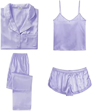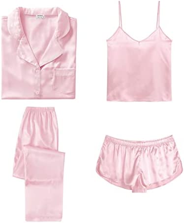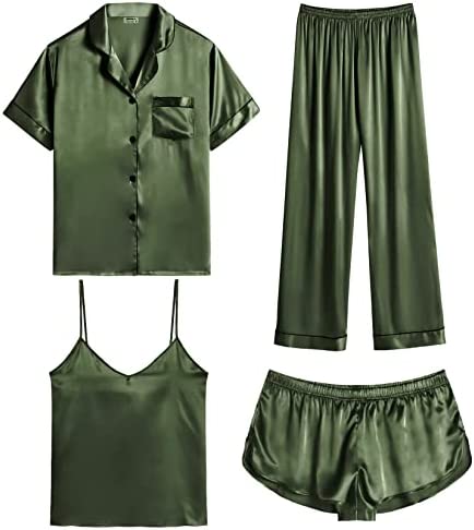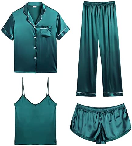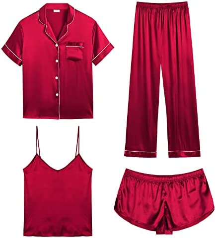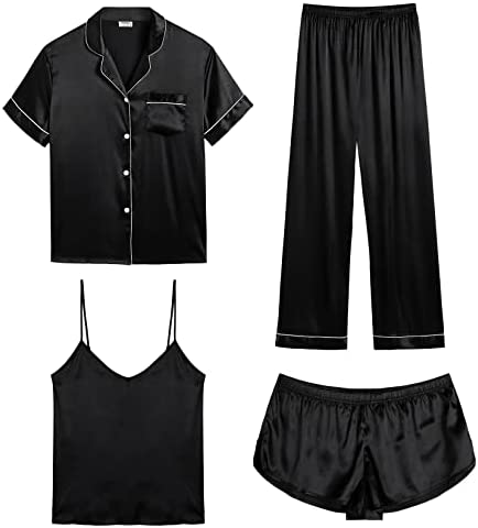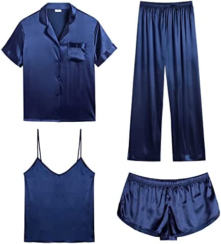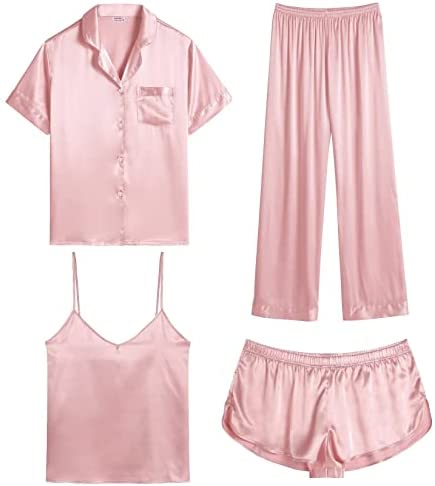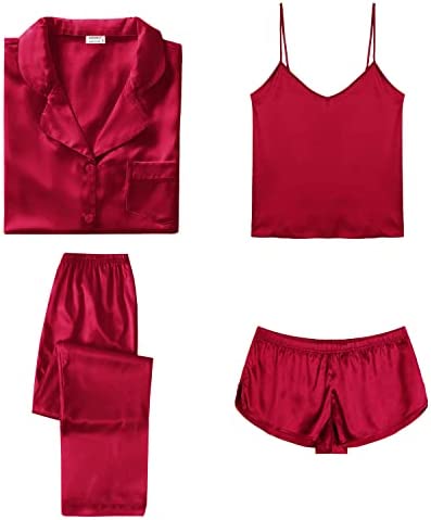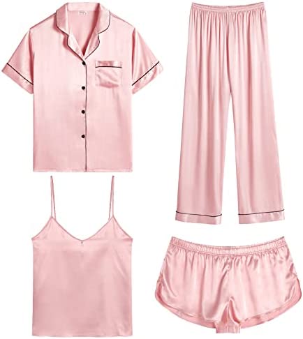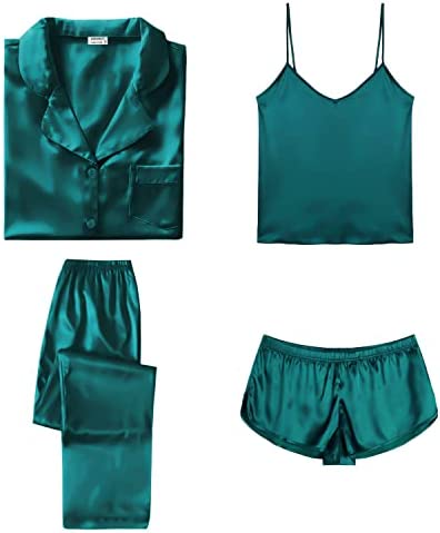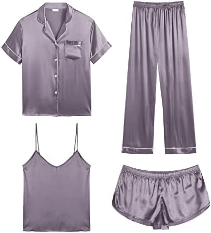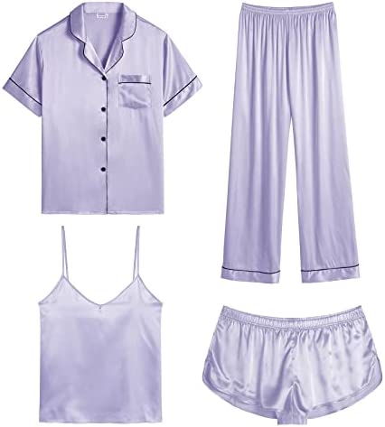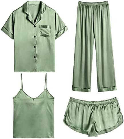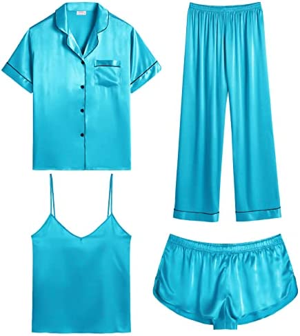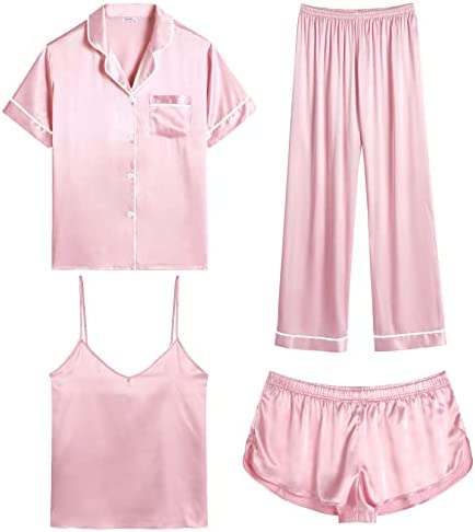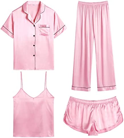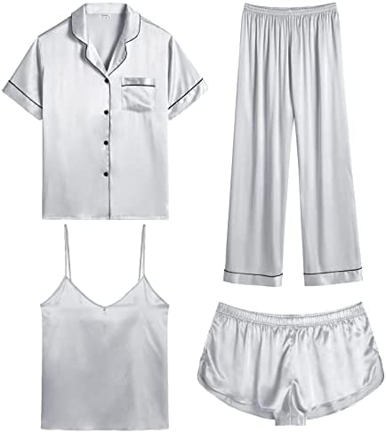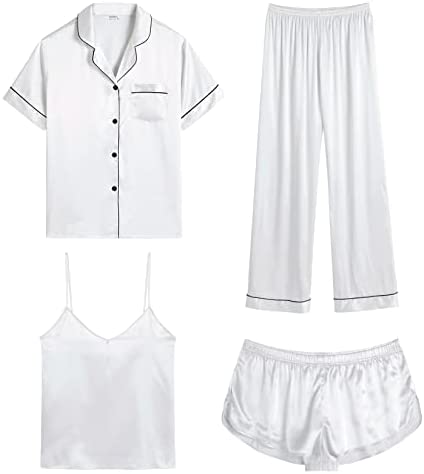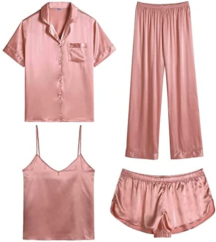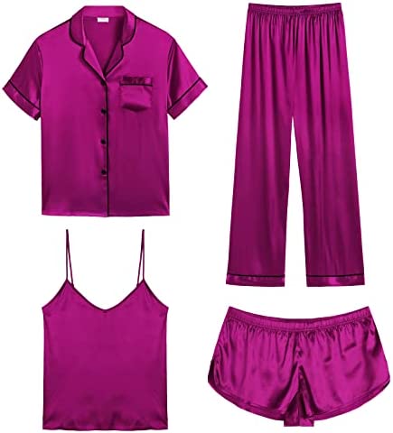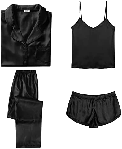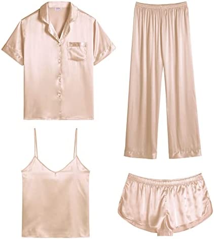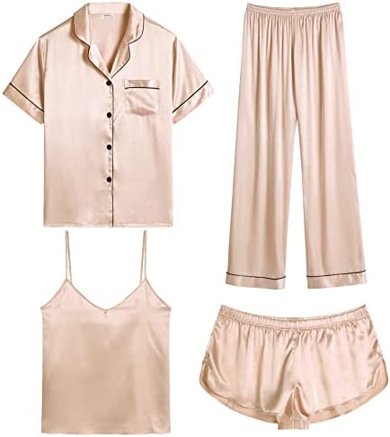 【Premium Material】--- This 4 piece pajama set is made of high-quality satin(95% Polyester, 5% Spandex), which is very soft, lightweight, and comfortable. This lightweight pajama set has a silky texture that will make you feel smooth and shiny, never pilling or fading, and help you sleep well, dreamlike.
