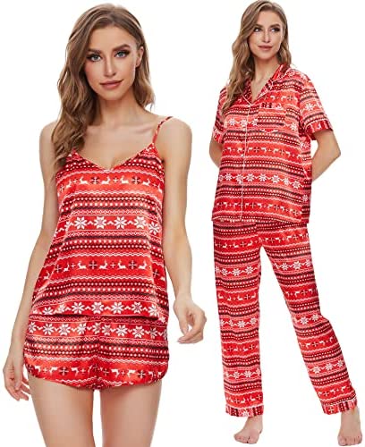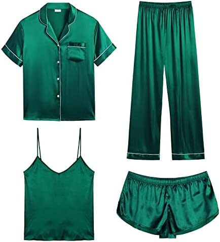 【4Pcs Pajama Set】--- Women 4 pcs pjs sets include spaghetti strap cami top, a button-down short sleeve sleepshirt, a pair of shorts, a pair of long pants. This four-piece sets for multiple wearing styles, you can match these sleepwear in different way to meet your needs in different weather and temperature.