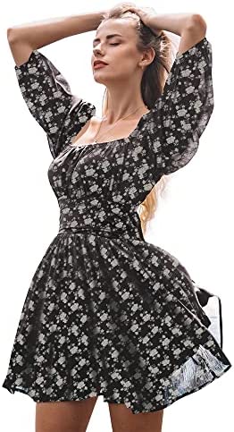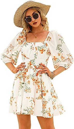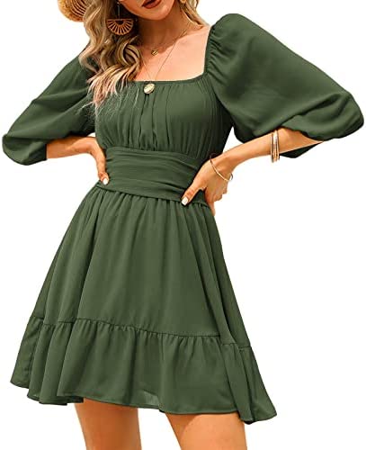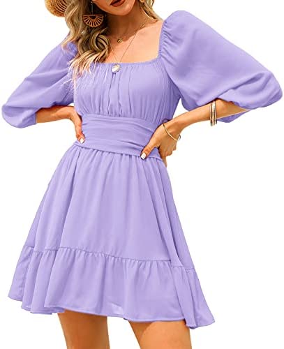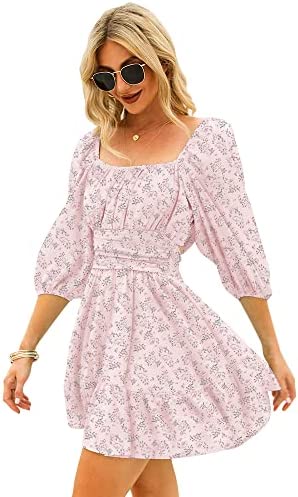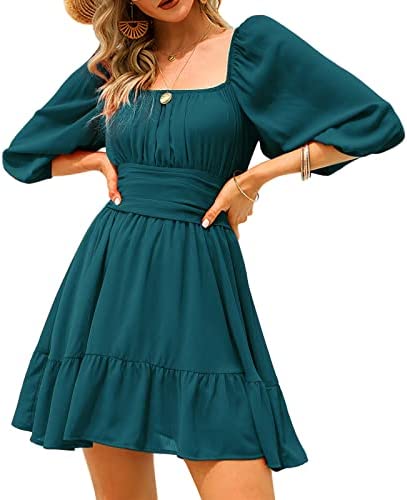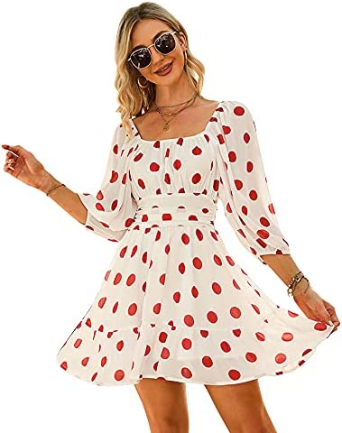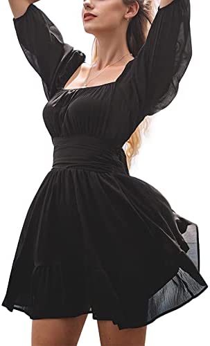 Design: square collar and lantern sleeves bring a retro style. The sleeves can be pulled down for a cute off-shoulder look. The elastic smocked waist dress shows the body curves. Sexy open back with adjustable self-tie bowknot. Pretty ruffle hemline finish.