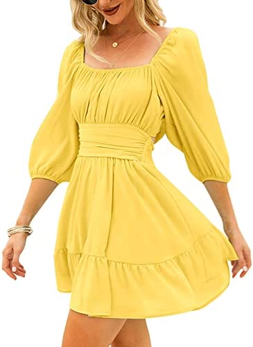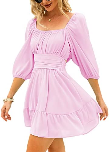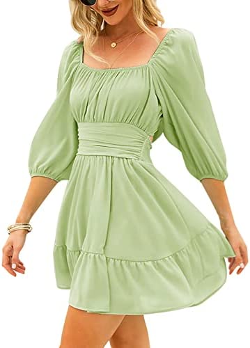 Feature: tie back, open back, square collar, ruched bust, smocked waist, elastic high waist, lantern sleeve, 1/2 sleeve, off shoulder, elastic cuff, above knee length, A line, slim fit, swing and elegant vintage style.