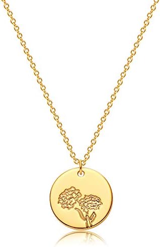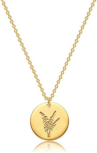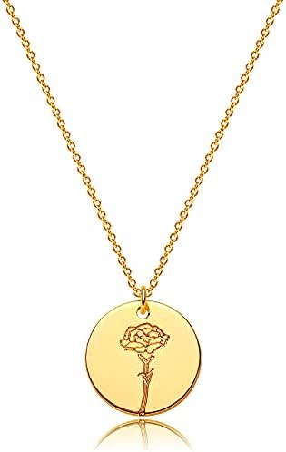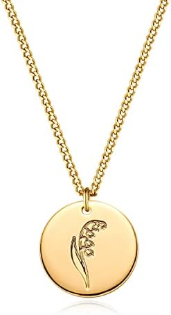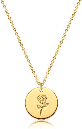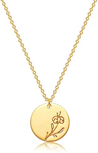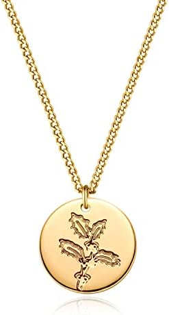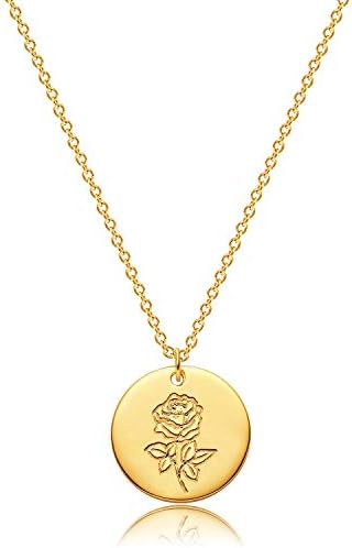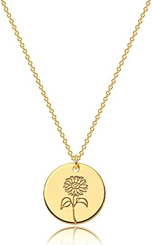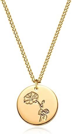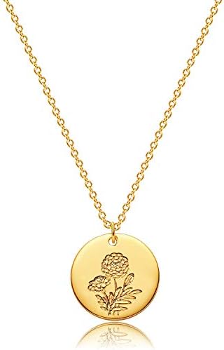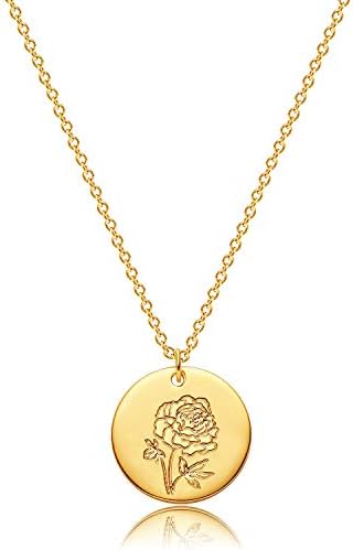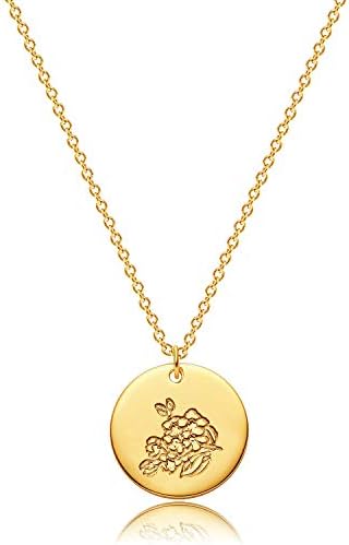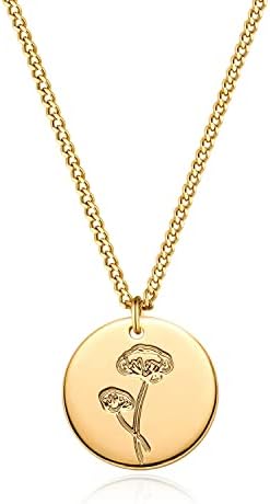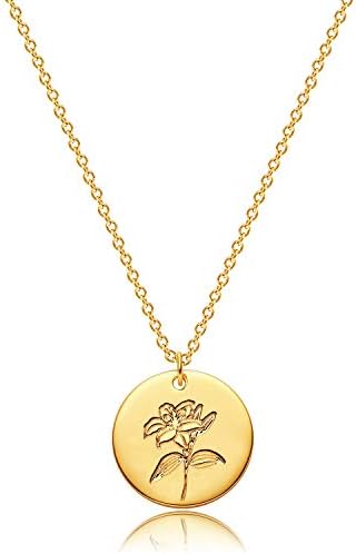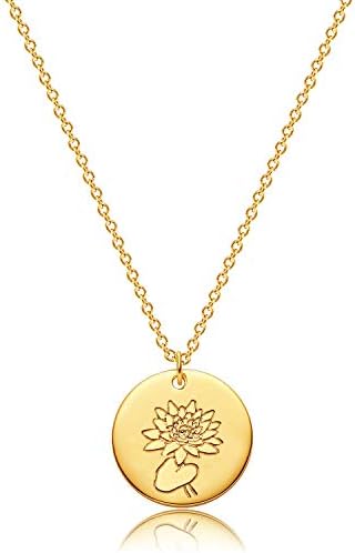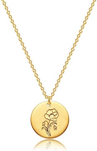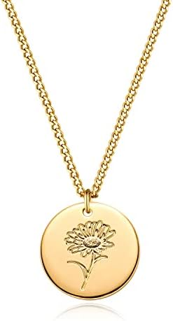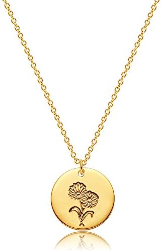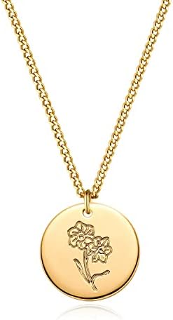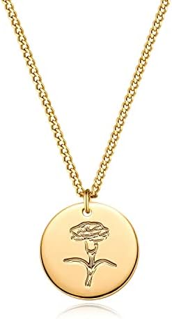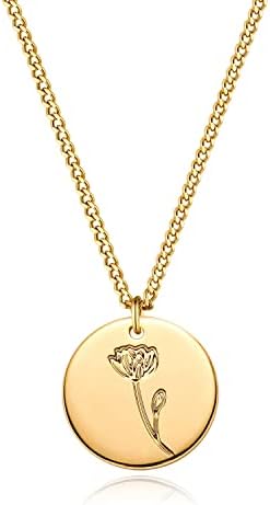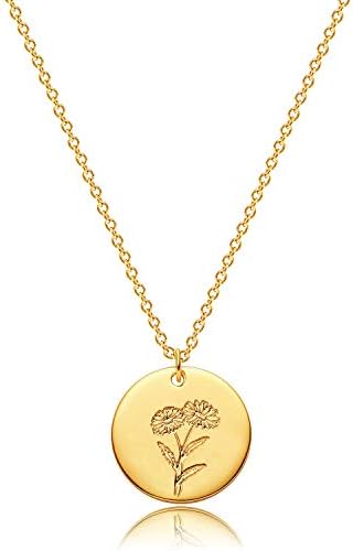 MEVECCO Birth Flower Necklace 18k Gold Engraved Custom Floral Pendant Necklaces Dainty Birth Month Flower Disc Charm Hand Stamped Flower Disk Necklace Personalized Jewelry Birthday Gift for Her