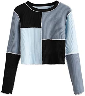 SheIn Women's Patchwork Color Block Crop Top Tees Long Sleeve Round Neck Ribbed Knit T Shirt