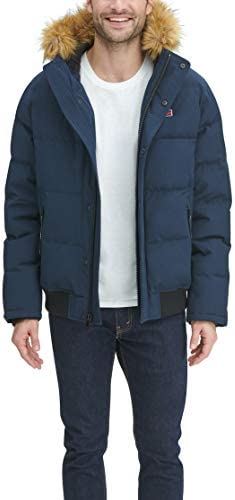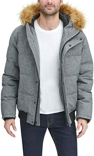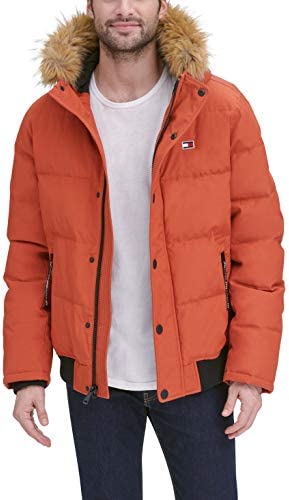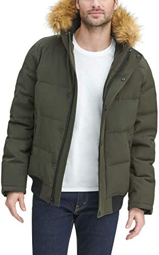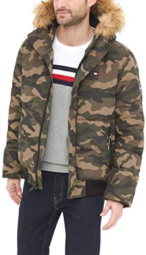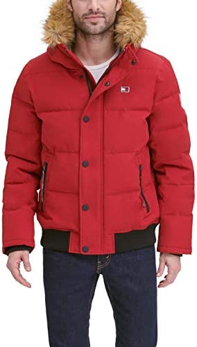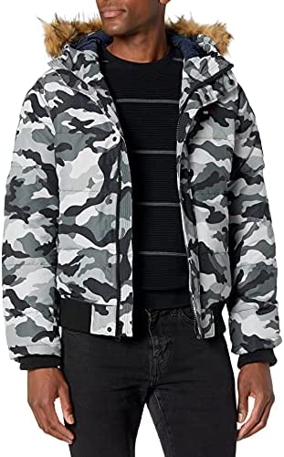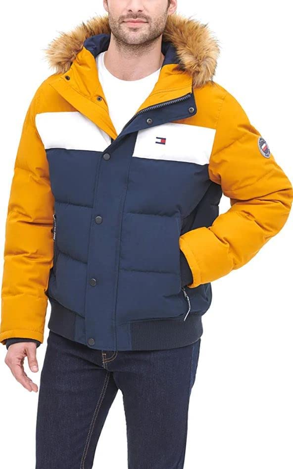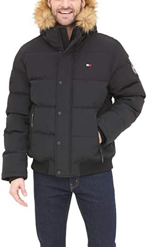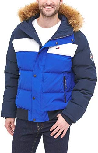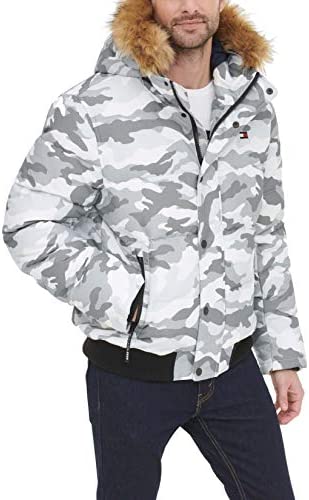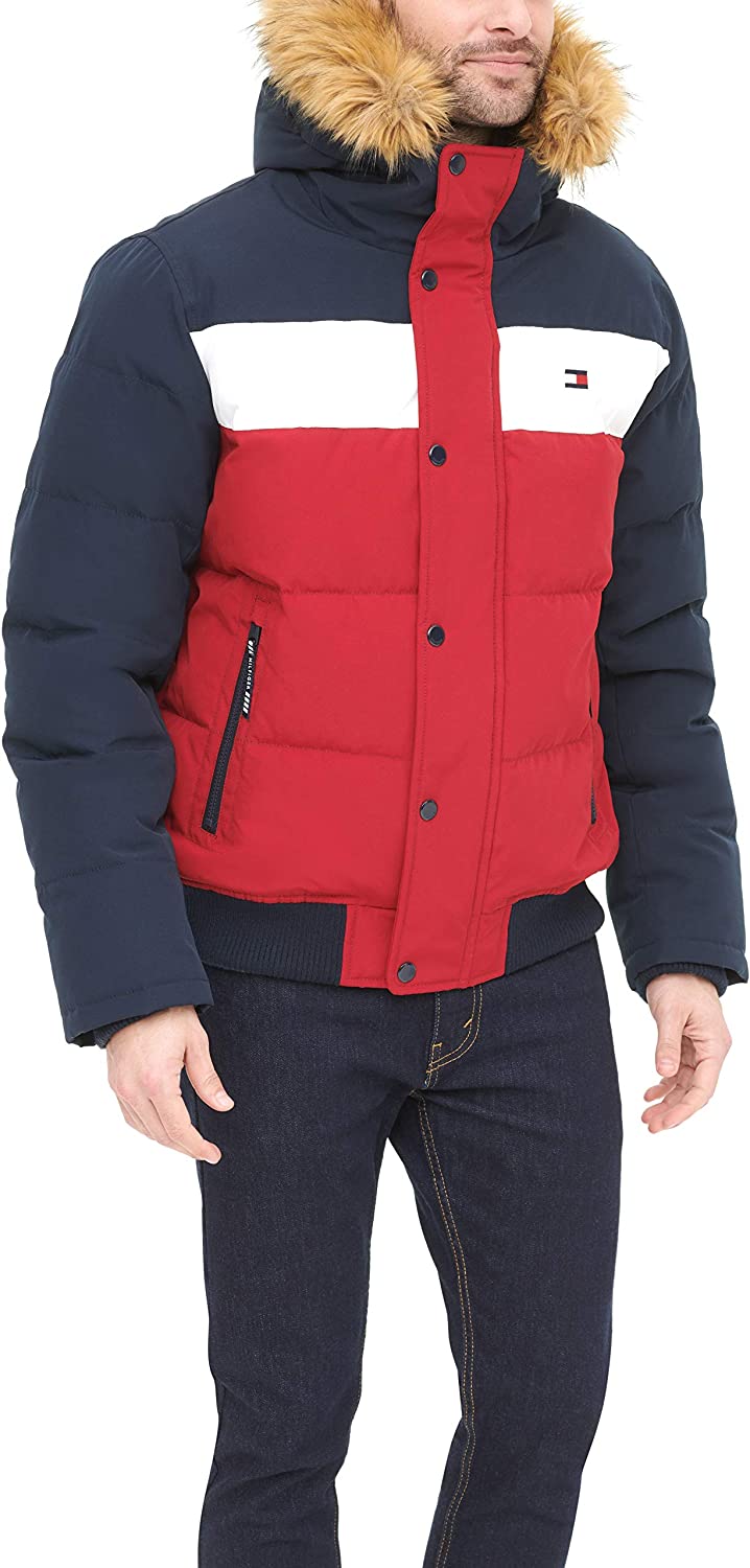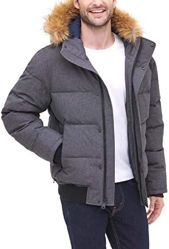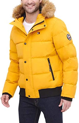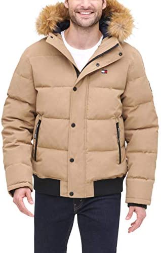 - Quilted snorkel bomber jacket in a wind and water resistant arctic cloth with a detachable faux fur trimmed hood