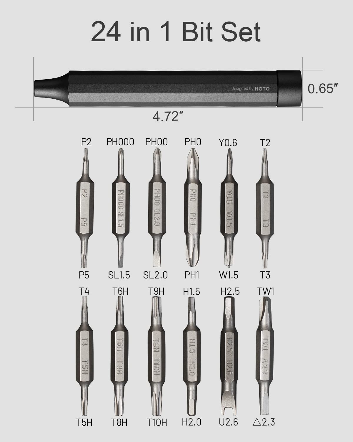 • 24-IN-1 BITS SET: HOTO Precision screwdriver set included the most common use size for electronics, glasses, bracelets, and as well as larger appliances, which completely fulfilled your need for precise & accurate work.Size included: Philips(PH000/PH00/PH0/PH1), Flat blade(SL1.5/SL2.0), Hex(H1.5/H2.0/H2.5), Torx bit set-without hole(T2/T3/T4), Torx bit set with hole (T5H/T6H/T8H/T9H/T10H), U-shaped(U2.6), Y-shaped(Y0.6), W-shaped(W1.5), Tri-Wing(TW1), Triangular(▲2.3), Pentagon(P2/P5).