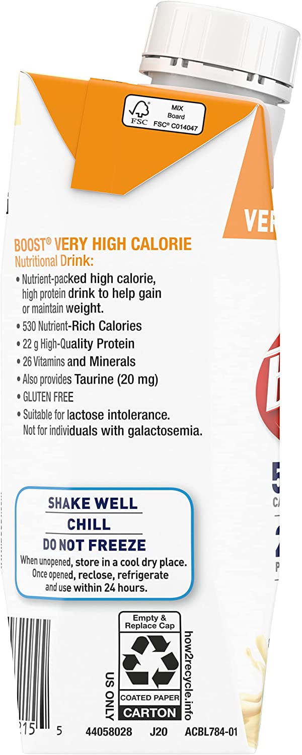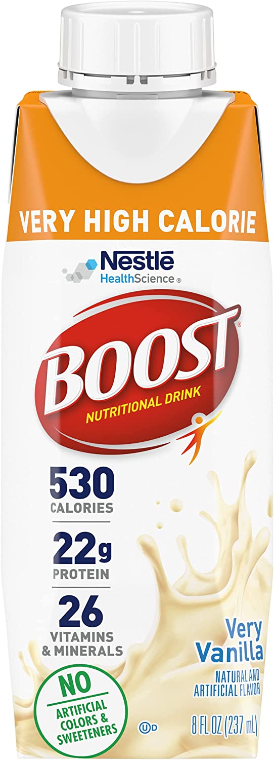 • Very High Calorie: BOOST Very High Calorie is a calorically-dense and nutrient packed nutritional drink and can be used as a snack or mini meal for those with low appetites; Available in Vanilla, Strawberry, & Chocolate flavors.